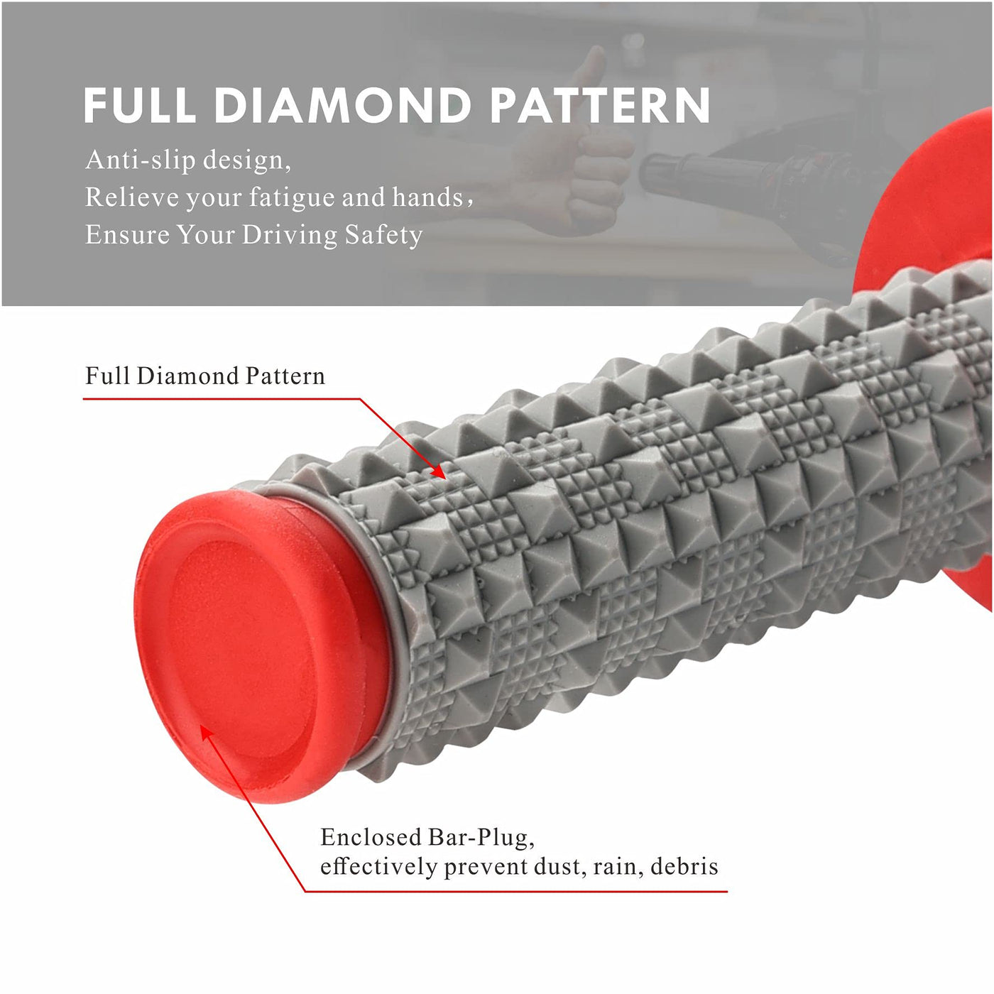 Q: How do these grips reduce arm fatigue during rides?A: The full diamond pattern design of these grips creates a triple density grip that effectively reduces arm fatigue while providing excellent control and comfort, making long rides more enjoyable.
