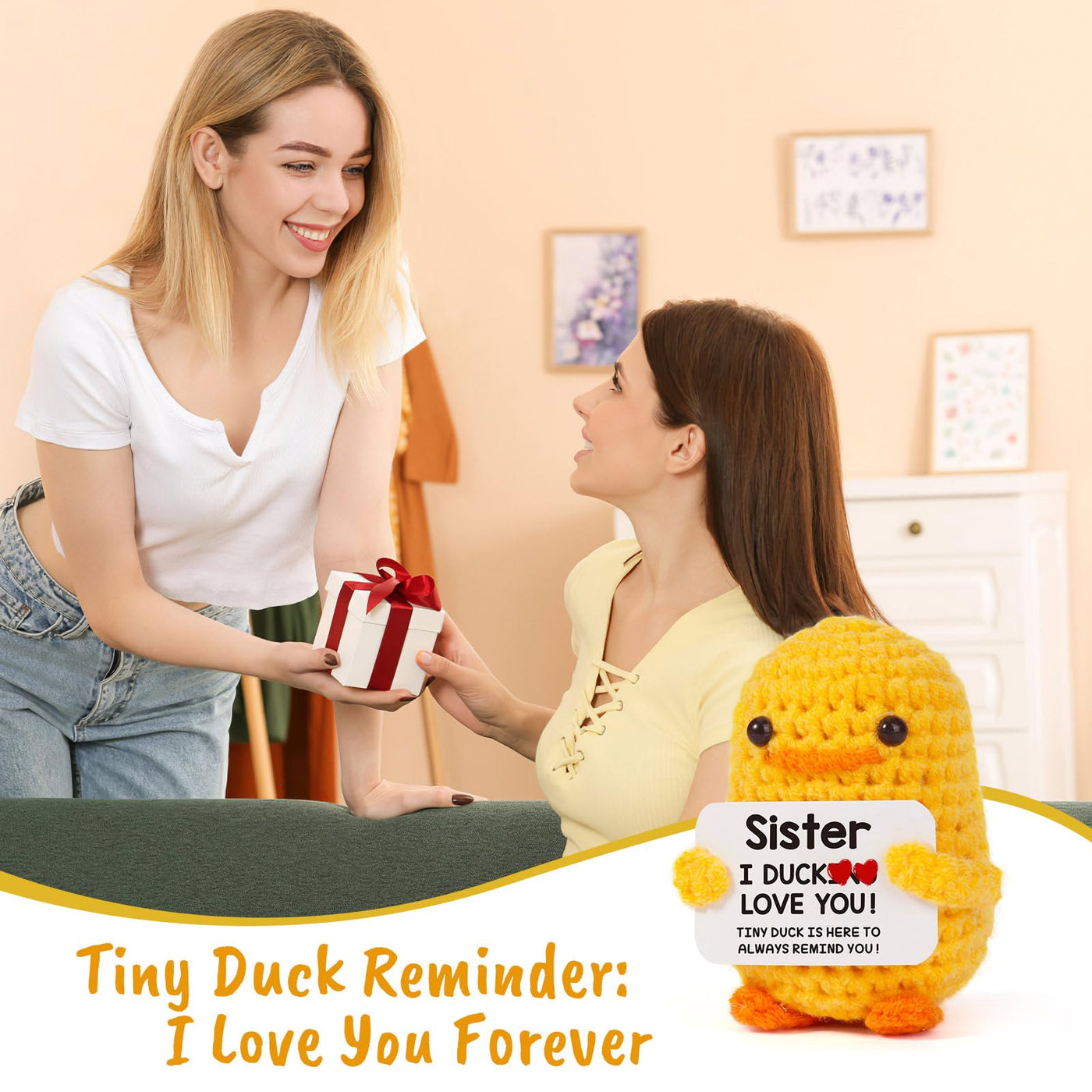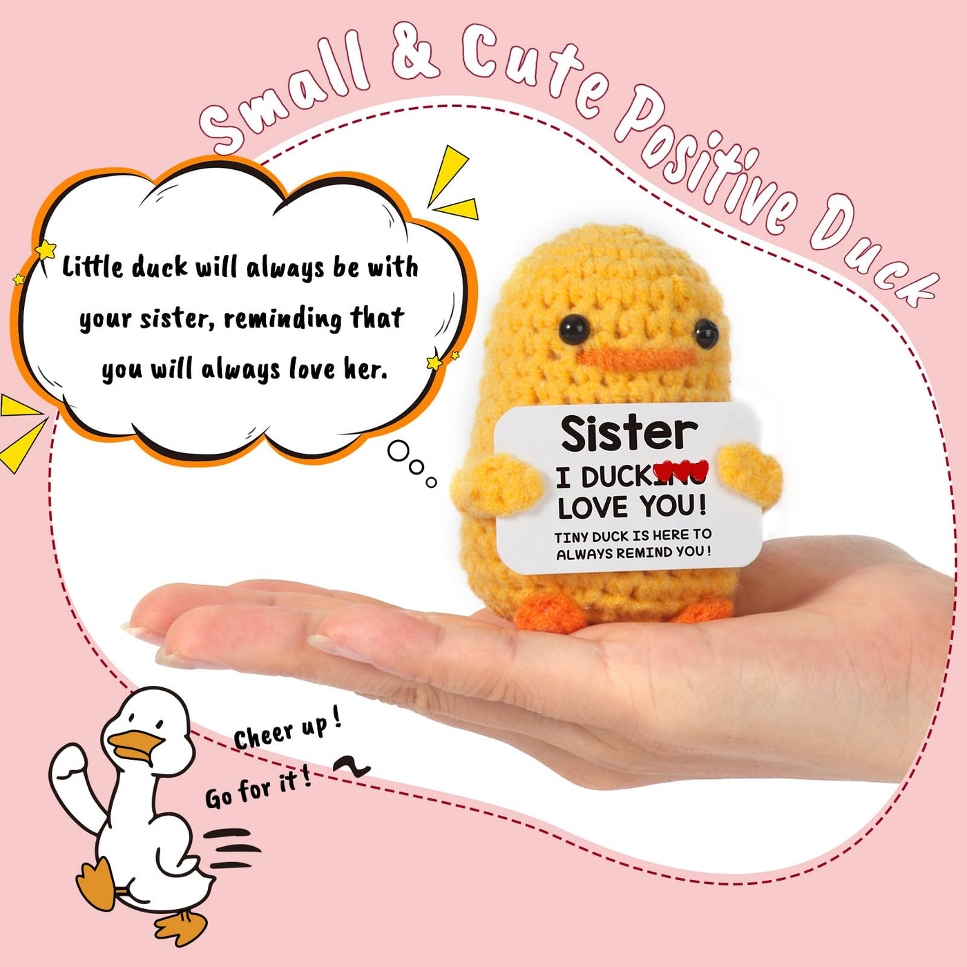 This delightful duck is the perfect gift for your sister, spreading smiles and positive vibes wherever it goes! It comes with a special positive card to uplift and encourage her. Whether she needs stress relief, a mood booster, or a reminder of your love, this cute knitted duck is there to bring joy. It's a unique and heartfelt gift that will make her feel loved and supported on any occasion.