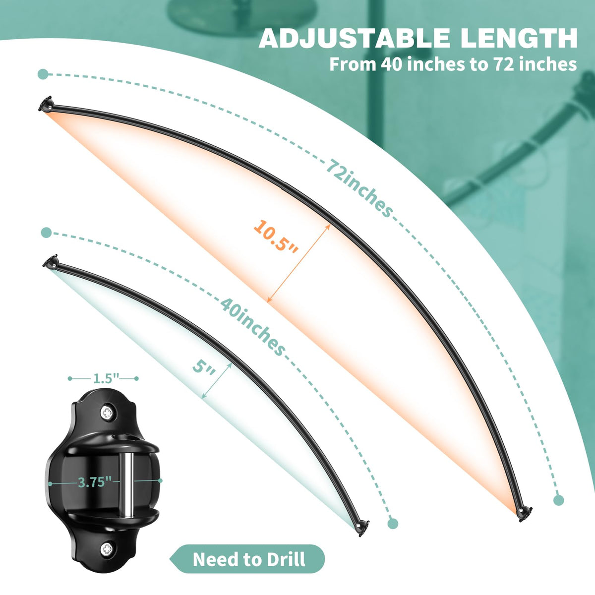 Q: What is the adjustable length range of the Mcrbeay Curved Shower Curtain Rod?A: The Mcrbeay Curved Shower Curtain Rod is adjustable between 40 to 72 inches, making it suitable for various bathroom sizes.