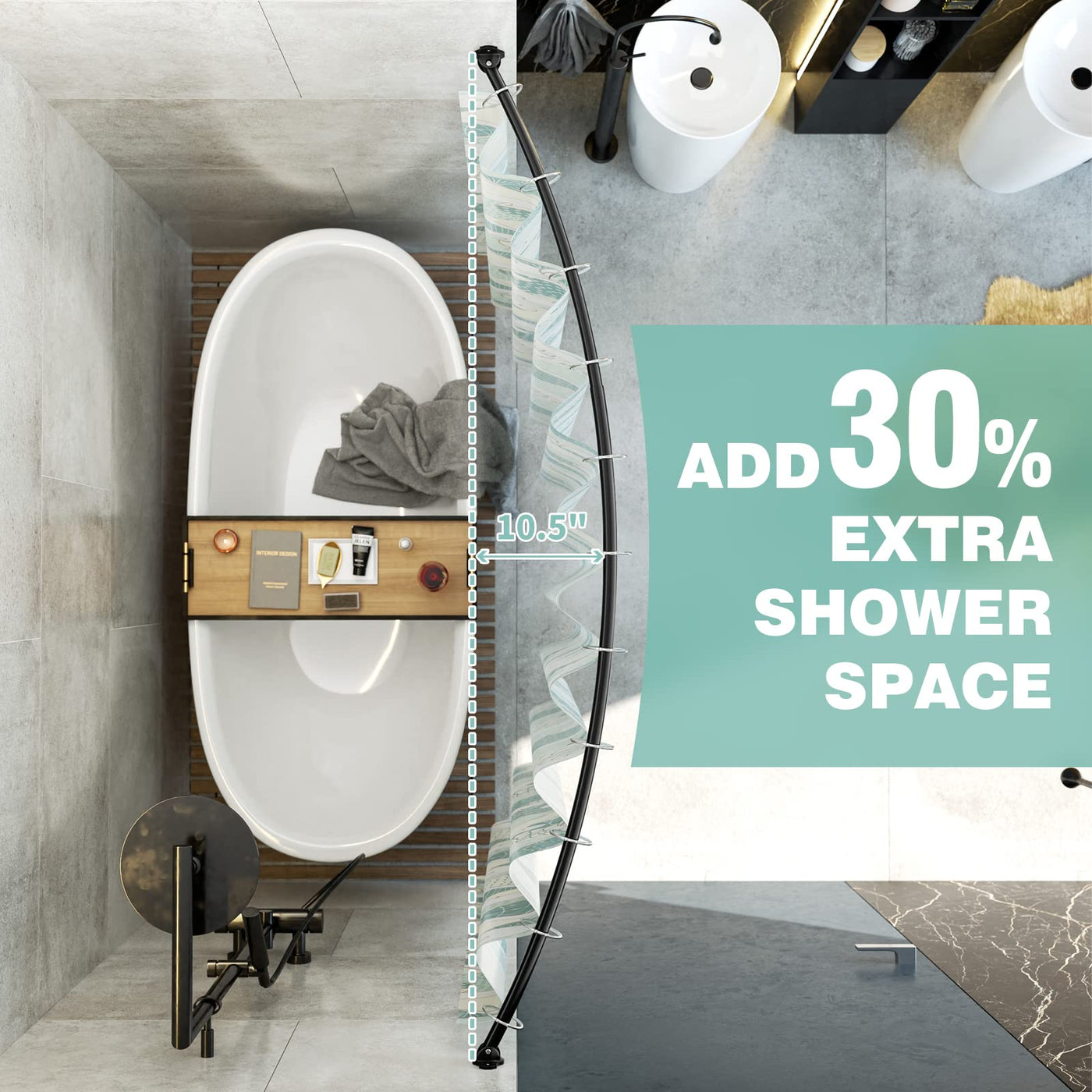 Q: How does the curved design of this shower rod enhance my shower space?A: The rounded design of the Mcrbeay shower curtain rod provides an additional 10.5 inches of elbow space compared to traditional straight rods, allowing for a more comfortable shower experience.