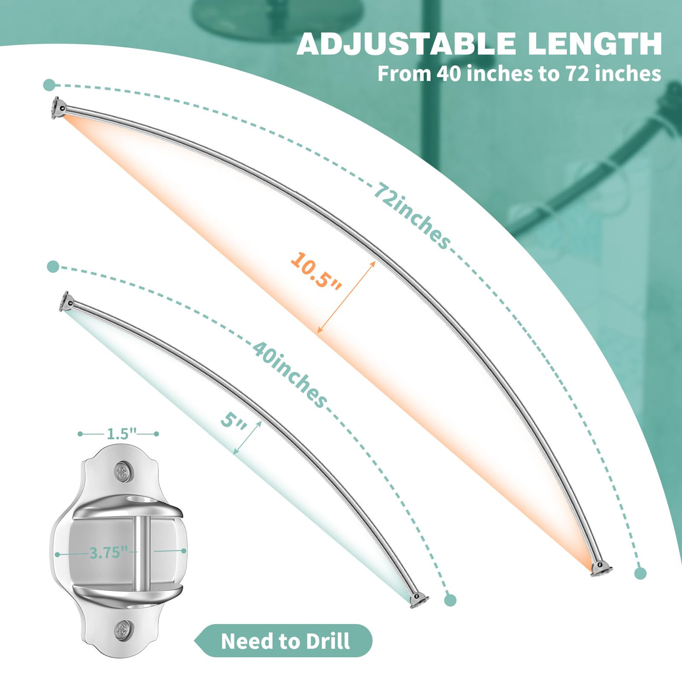 Q: What is the size range of the Mcrbeay Curved Shower Curtain Rod?A: The Mcrbeay Curved Shower Curtain Rod is adjustable and can be extended from 40 to 72 inches, making it suitable for various bathroom sizes.