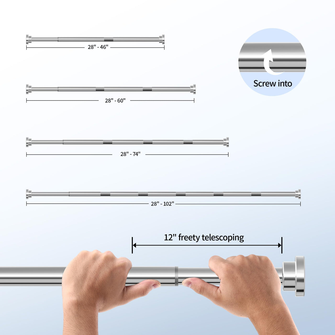 Q: What sizes does the Mcrbeay Shower Curtain Rod accommodate?A: The Mcrbeay Shower Curtain Rod is adjustable and can be customized to fit your space, extending from 28 inches to 102 inches to suit various bathroom sizes.