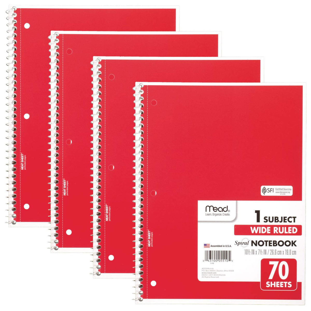 Mead Spiral Notebooks, 4 Pack, 1-Subject, Wide Ruled Paper, 10-1/2'' X 7-1/2'', 70 Sheets Per Notebook, Red (38112)