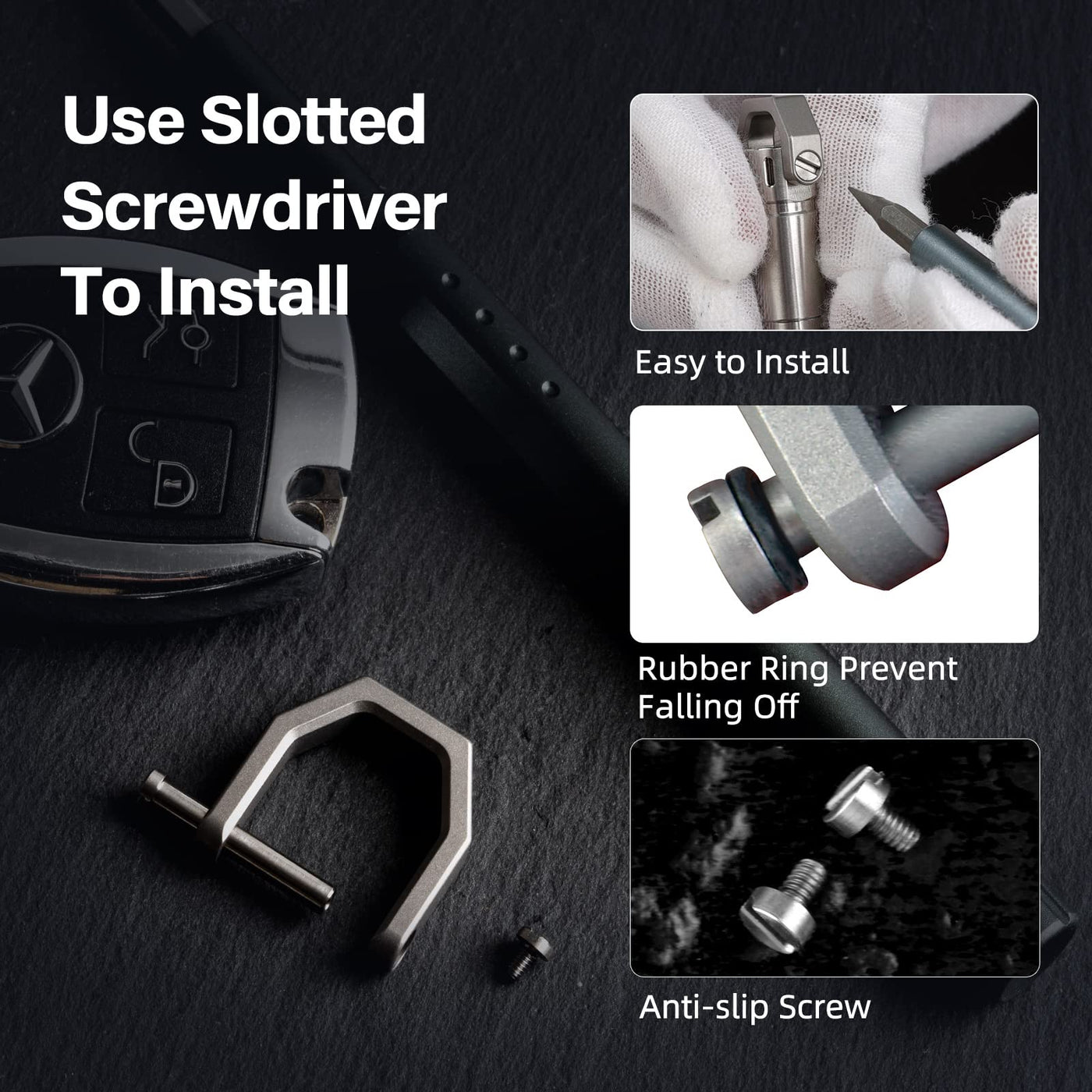 Q: How do I install the D ring on this keychain?A: The D ring features a screw design for easy installation. Simply use a flat head screwdriver to secure it, making it convenient for quick adjustments.