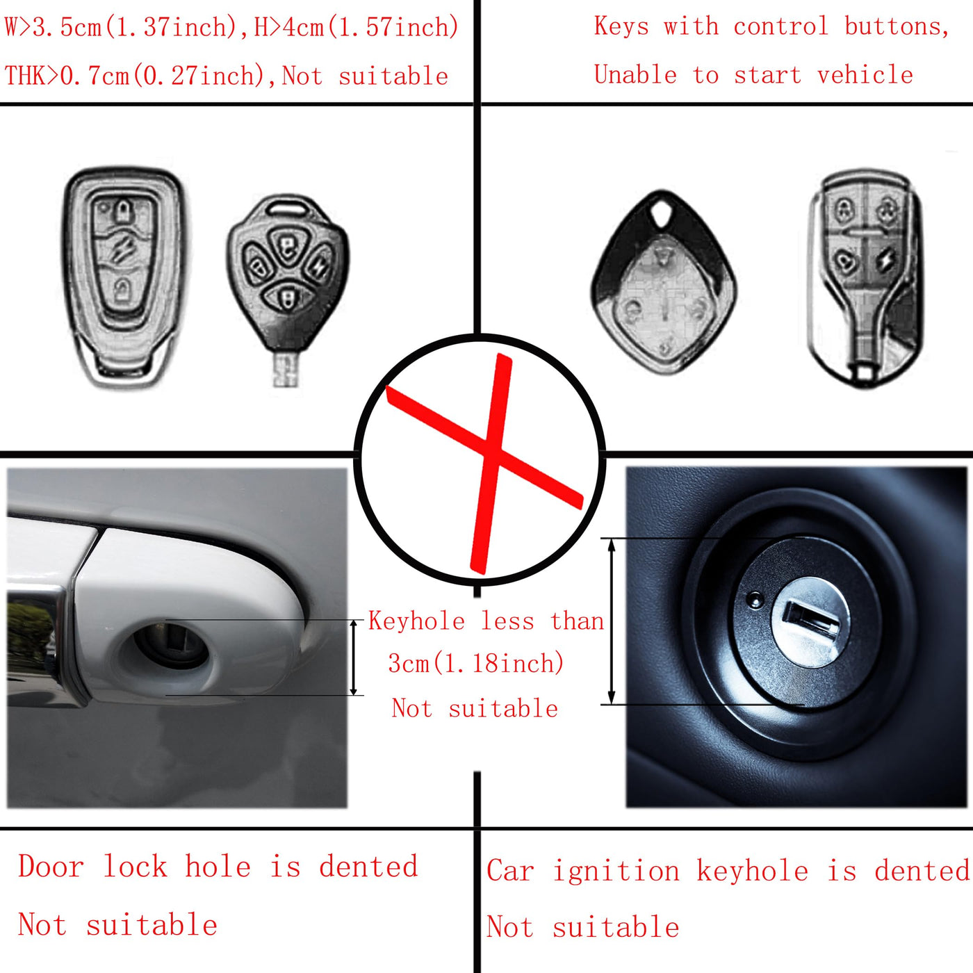 If your keys are too small and move up and down inside the bag, you can stuff a little paper into them to secure them. In order to avoid the key sleeve not suitable for your key, please see the picture for details. Please note before purchasing: If your key has a control button, this key cover is not suitable Typical product returns are the following . I hope it will be helpful to buyers and avoid unnecessary troubles. >>>1,Too big my key will not start my car. >>>2,Chipped key didn't work with this case >>>3,Leather is too thick, key is not able to enter ignition for it and turn on car. This product can not only put keys, but also can be used as a coin purse and locator cover, and the size is also very suitable. One set is multi-purpose. key holder size: 5.5cmx 6.5cm(2.17 x 2.56 inch ),keychain size:12.8cm x 2cm(5.04 x 0.79inch) Please see picture for detailed size 1?The material is made of first-layer cowhide and sewn with wax thread. The keychain is equipped with an eagle beak buckle and a key ring. It can carry different styles of keys and can also fix damaged keys well. 2?The design of the key cover is wide at the top and narrow at the bottom, and the narrowest part is only 3cm (1.18inch). This design can solve the problem that the keyhole of most cars is sunken and the key cannot be started when the key is installed in the cover. 3?Easy to carry - can be hung on a belt, placed in a pocket, or worn on backpacks and shoulder bags as an accessory 4?Usage scenarios - A large key cover that can be used for damaged keys, and can fit most building door keys, motorcycle keys, and car keys. Not all keys are suitable. Square controller keys are not suitable, large-sized keys are not suitable, and ordinary keys with control buttons are not suitable. The start button is not sensitive and cannot start the vehicle.