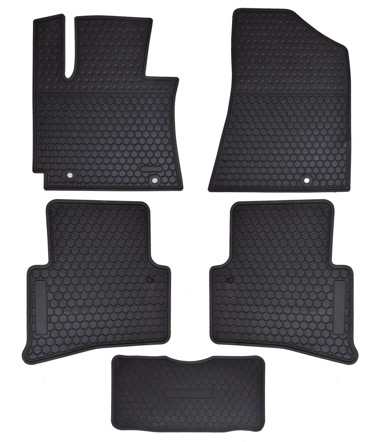 Q: What features help protect my car's interior with these mats?A: The floor mats feature a deep hexagon design that keeps dirt, mud, and liquids contained. This design helps resist damage from sand, water, oil, and battery acid, ensuring your car's carpet remains clean and dry.