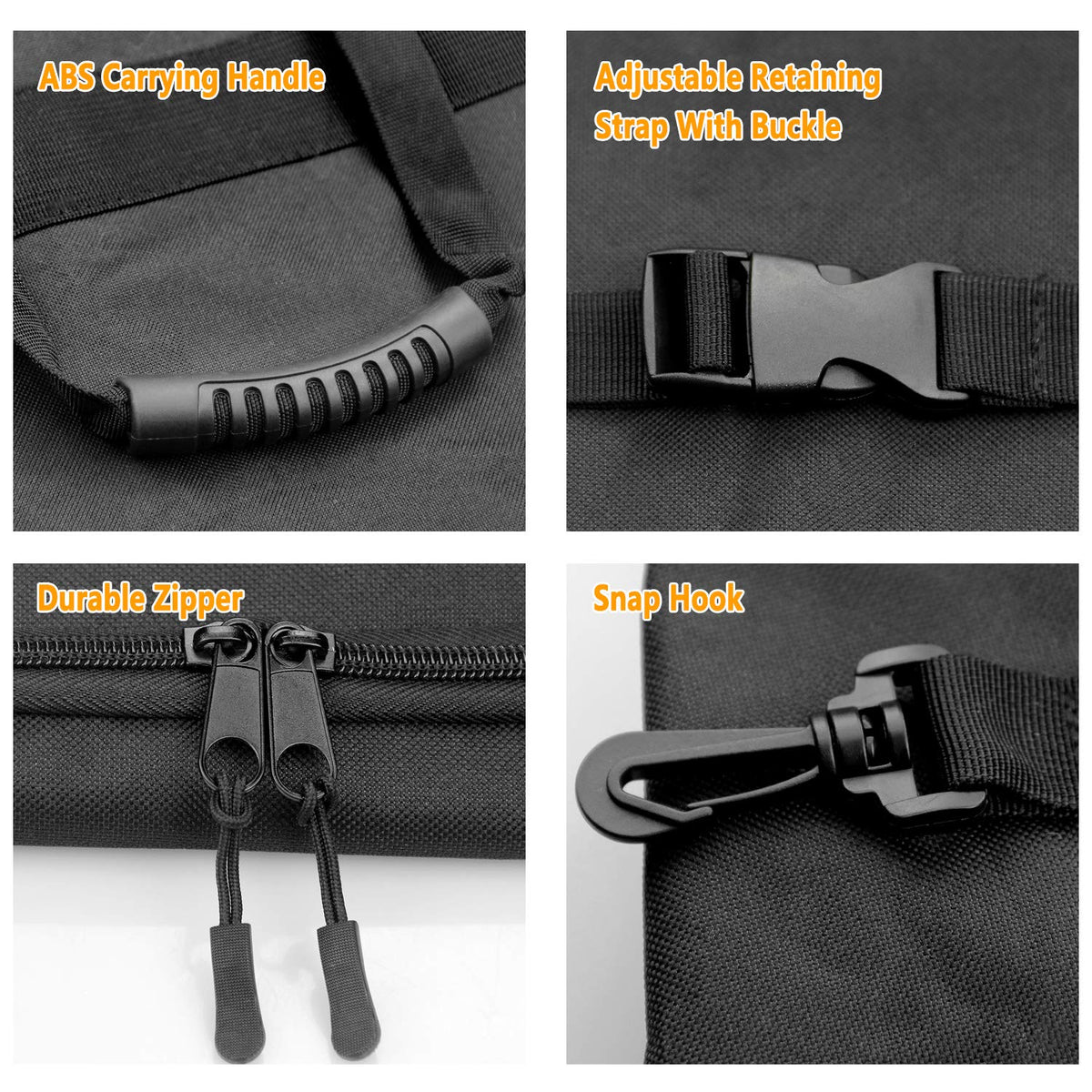 Q: What materials are used in the construction of the storage bag?A: The storage bag is made from high-quality black vinyl coated fabric, which is OEM approved, along with a soft non-woven backing and interior pockets for added durability and protection.