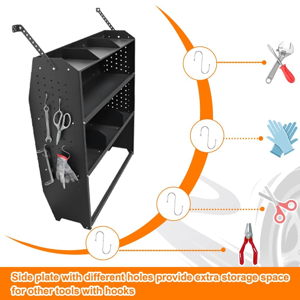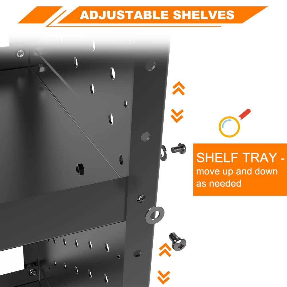 Drilling Required: Before assembling promaster shelves, you need to drilled holes in the van walls and floor. Adjust bracket to fix the distance between the van wall and shelving storage. Plastic cover will cushion the impact of items and van wall to reduce friction | Good Adjustability: Van shelves offer adjustable shelf heights and dividers, let you configure the shelf spacing and create custom storage sections for different tools and equipment | Heavy Duty Construction: Ford transit shelves are constructed from sturdy steel materials, providing maximum durability and strength and ensuring the shelves securely hold heavy tools and equipment. Also reinforced brackets are engineered to withstand the weight of the loaded shelves, preventing wobbling or shifting during transit | Holes Designed: Side plates of chevy shelves are designed with various holes, can hold various small tools via S-shape hooks we provide for you. Increase van shelving storage capacity | Fit For: Work van shelving fits for Low/Mid/High Ford Transit, Chevrolet Express/GMC, Nissan NV, RAM Promaster, Sprinter and Metris. Product dimension is 42'' W x 46'' H x 13'' D