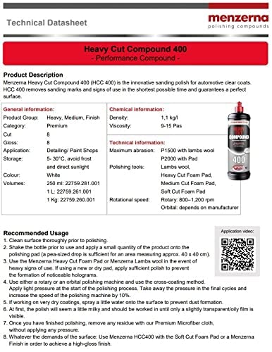 Heavy Cut Compound 400Performance Compound Polishes To Gloss In Just One Process Step. The Innovative Cut Compound For Automotive Clear Coats Leaves A Dazzling Impression Everywhere. Gets Sandingmarks Out Of The Way In Record Time. Works Into The Finish Range Thanks To The Latest Polishing Technology With Dividing Polishing Grit. Advantages: Polishes And Produces Gloss In One Step Saves Time Thanks To One-Step Polishing Process High Efficiency High Gloss Level Polishing Tool: Hard Pad, Lambs Wool Process Example: Super Heavy Cut Compound 400 - Super Finish 3500 - Power Lock Ultimate Protection Please Note: Formally Menzerna Fast Gloss 400 Compound (Fg400) Warning: This Product Can Expose You To Chemicals Which Is [Are] Known To The State Of California To Cause Cancer And Birth Defects Or Other Reproductive Harm.