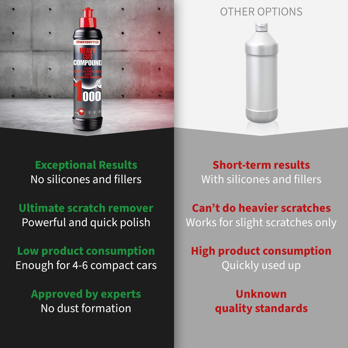 Make New From Old With Menzernaheavy Cut Polish 1000&Nbsp;Scratches, Sanding Marks, Hologram And Matting Effects &Ndash; All Of These Imperfections Can Make A Brand New Car Look Old. The Heavy Cut Polishing Compound By Menzerna Can Help You Buff These Marks Out Of Your Car. Enjoy Your Daily Drives With That Brand New Car Feeling!&Nbsp;It Does Not Matter If You Are A Professional Or Not, Detailing A Car Has Never Been This Easy. Start Off By Washing And Cleaning Your Car With The Menzerna Control Cleaner. Go On By Buffing Your Car With The Heavy Cut Compound 1000 By Using Criss-Cross Motions. The Milky Film Should Be Worked In Until Its Semi-Translucent. Wipe Off Any Residue With A Microfiber Cloth. Follow Up With Our Step 2 And 3 Polishes And Step 4 Top Coats To Seal The Deal. You Can See The Final Results After 20 To 30 Minutes Of Drying Time. Combine Different Density Foam Pads For The Best Results Possible.&Nbsp;Glossy Shine With The Menzerna Polishing Systemthe Menzerna Polishing Program Is Designed To Make Buffing And Polishing Your Car As Easy As Possible. Depending On The Degree Of Surface Defects And The Desired Result, You Start With One Of Our Heavy Cut Products (Red Label), Then One Of Our Medium Cut Products (Yellow Label) Or Finishing Products (Green Label) Or Use These Products In Combination If Necessary. Always Work From Heavy Cut To Finish. Some Of Our Products Even Combine 2 Or More Products (400, 3In1), So You Save Effort And Get To Your Destination Faster. The Color Of The Labels Correspond To The Color Of The Matching Pads. This Way, You Will Not Be Confused By The Variety In Different Compounds, Polishers And Wax Sealants.