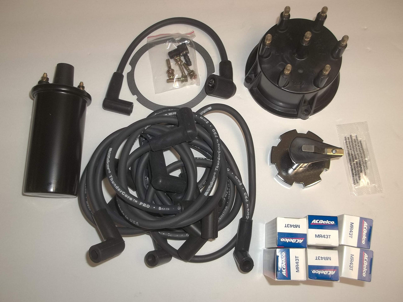 Q: What components are included in the Mercruiser Thunderbolt 4.3 L V6 kit?A: The kit includes a new ignition coil, distributor cap, rotor, spark plug wires, and six AC Delco MR43LTS spark plugs, providing all essential parts needed for a complete ignition system upgrade.