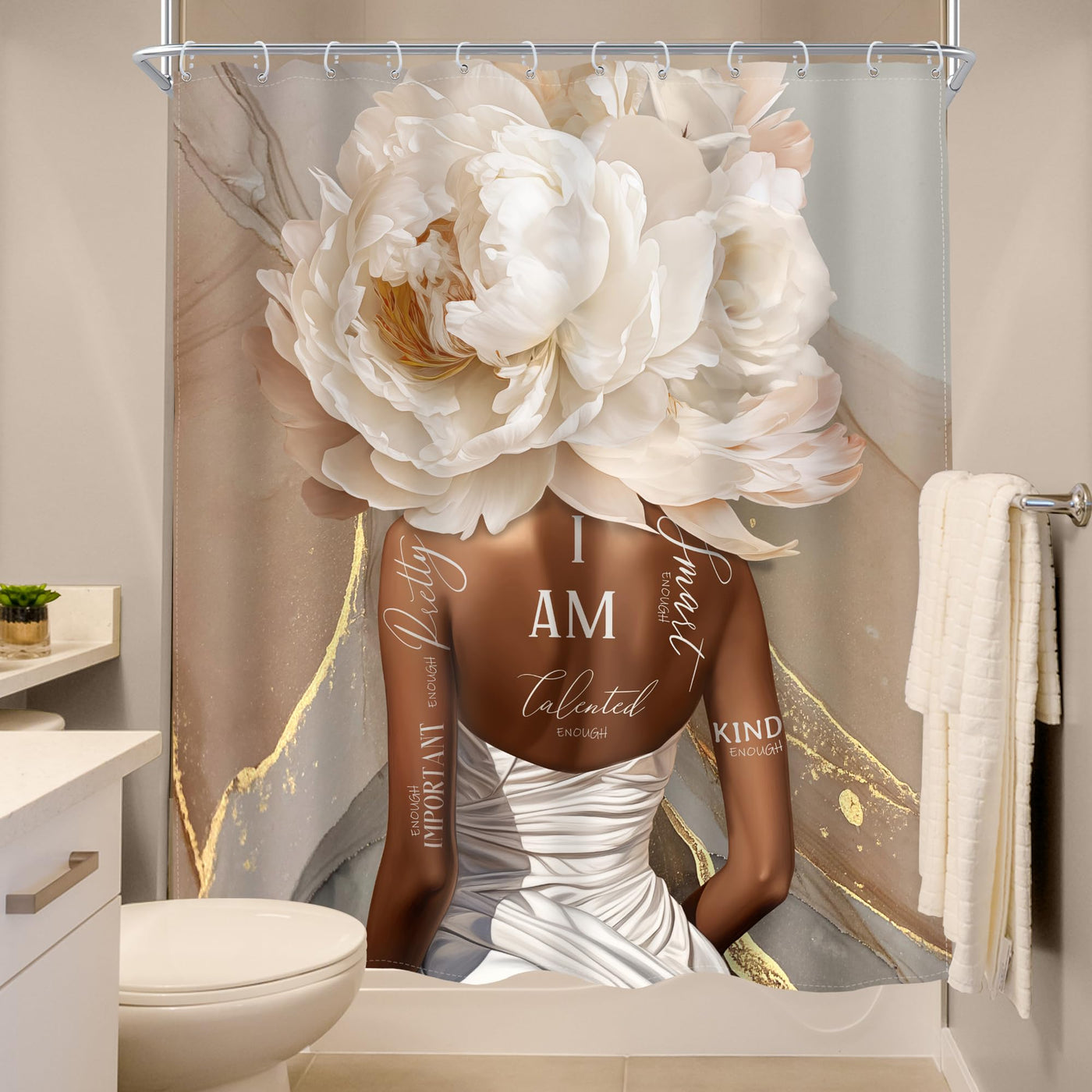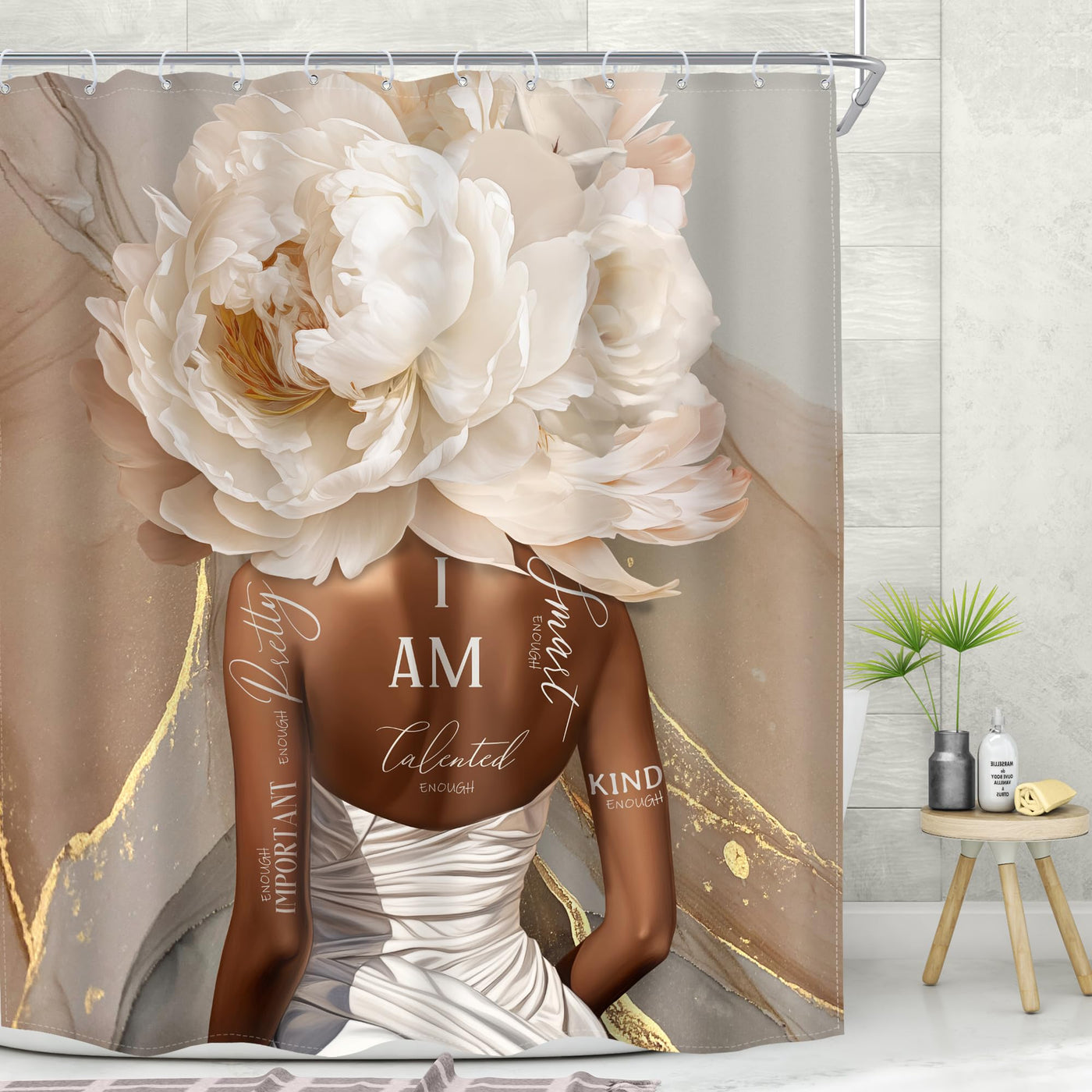 Meshelly African American Abstract Shower Curtain 60Wx72H Pink Marble Shower Curtain Black Girl Shower Curtain Rose Gold Flower Positive Quotes Floral Black Women Bathroom Decor Fabric12 Hook