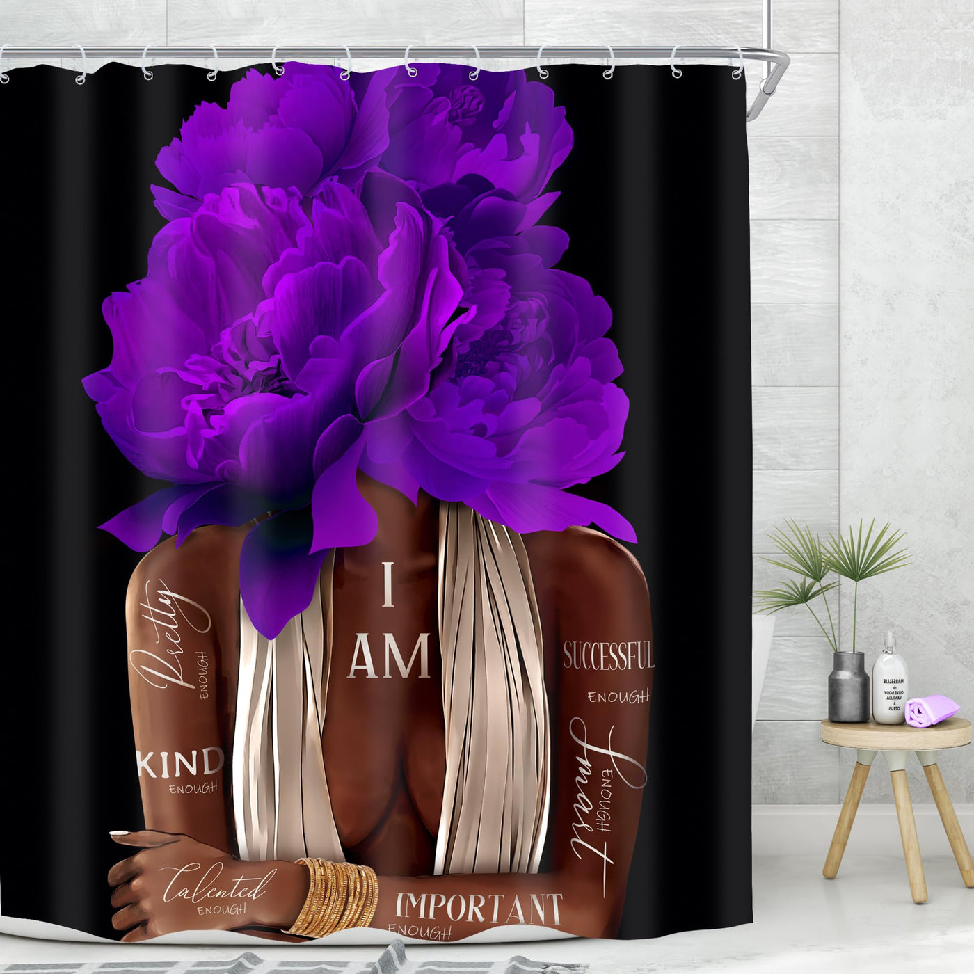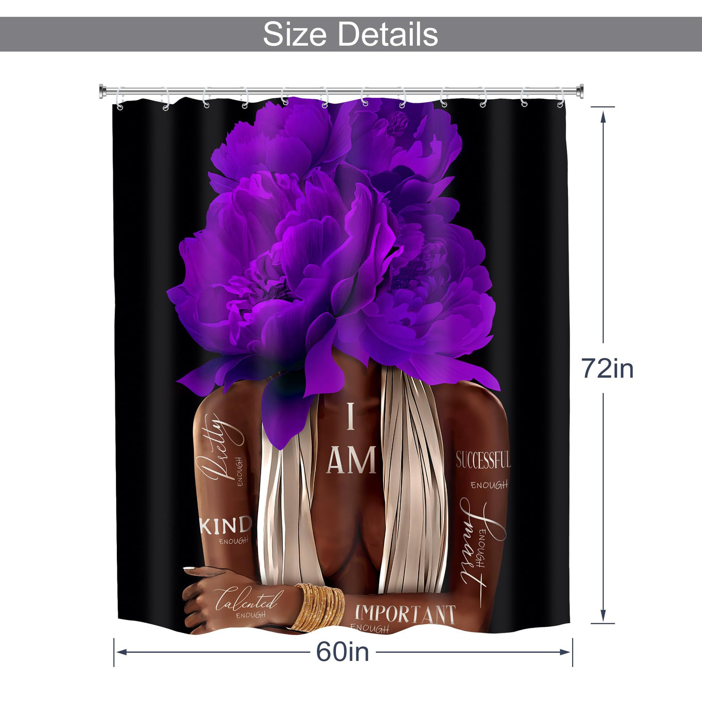 Meshelly Purple Shower Curtain 60Wx72H African American Woman Peony Flower Bathroom Curtain Black Girl Floral Inspirational Quote Bath Curtain Fabric Afro Lady Positive Bathroom Decor With 12 Hook