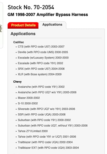 Q: Is the Metra 70-2054 amplifier bypass harness compatible with my GM vehicle?A: The Metra 70-2054 amplifier bypass harness is designed for select 1998-2004 GM vehicles. To ensure compatibility, please verify your vehicle's RPO code and check the product specifications.