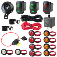Make them an essential accessory for your outdoor drive with our turn signal kit for SXS ATV UTVs. With its reliability and durability, this turn signal light kit is easy to use even in inclement weather, while being widely compatible with a wide range of car models. Product Name: Universal ATV UTV SXS Turn Signal Kit Products include: 1*turn signal switch 1*danger switch 1*horn switch 1*fuse with holder 1*adjustable relay 1*105DB speaker 4*yellow lights 4*red lights 2*white lights 2*reverse lights 1*red extension cord 1*black extension cord Features: 1. The utv turn signal kit is equipped with 2 pieces of 158-inch extension cables to meet your various wiring needs, aiming to provide you with more flexible use possibilities. 2. The adjustable flash relay allows you to customize the flash frequency and mode according to different scenes and preferences to achieve personalized flash effects. 3. The waterproof horn in the rocker switch is very suitable for outdoor use in the driving room. It can maintain excellent sound quality for a long time, and it will be your ideal choice.