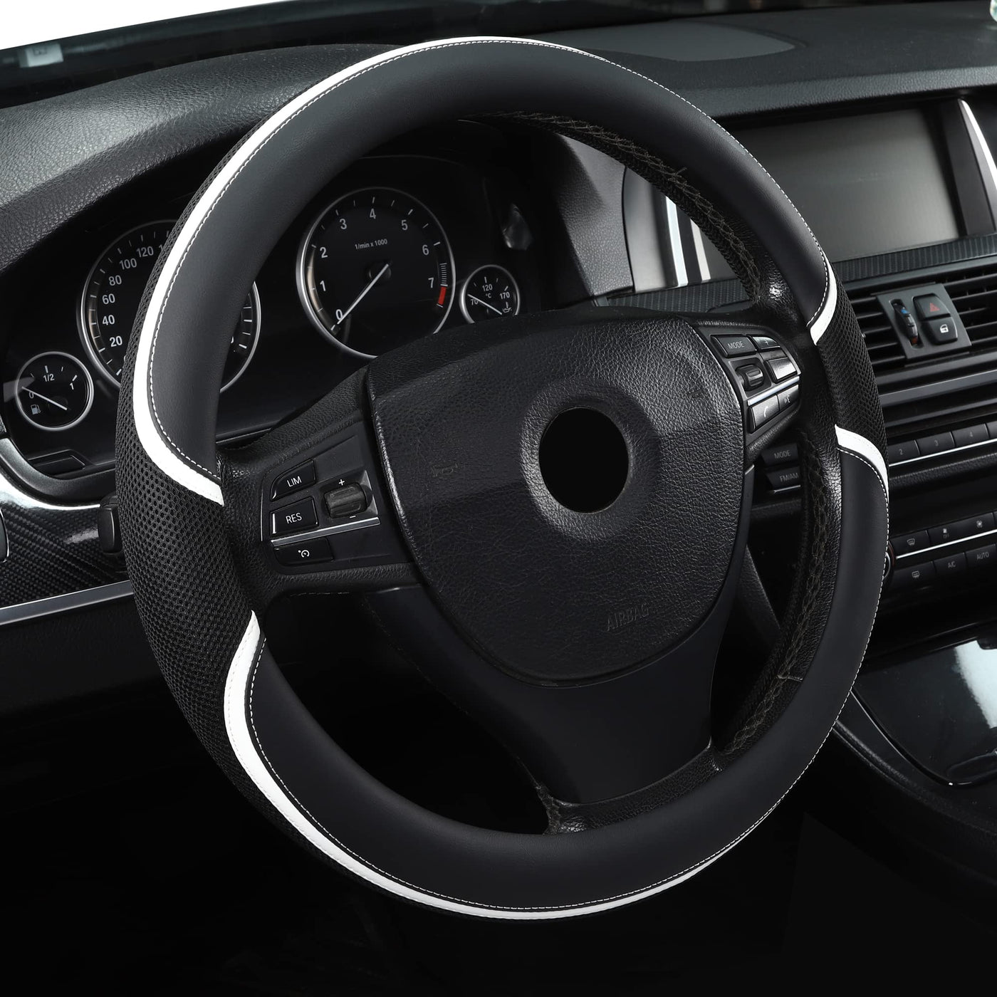 Q: What is the material of the steering wheel cover?A: The cover is made from high-quality faux leather, which provides a luxurious feel while being durable and easy to clean, making it an ideal choice for daily use.