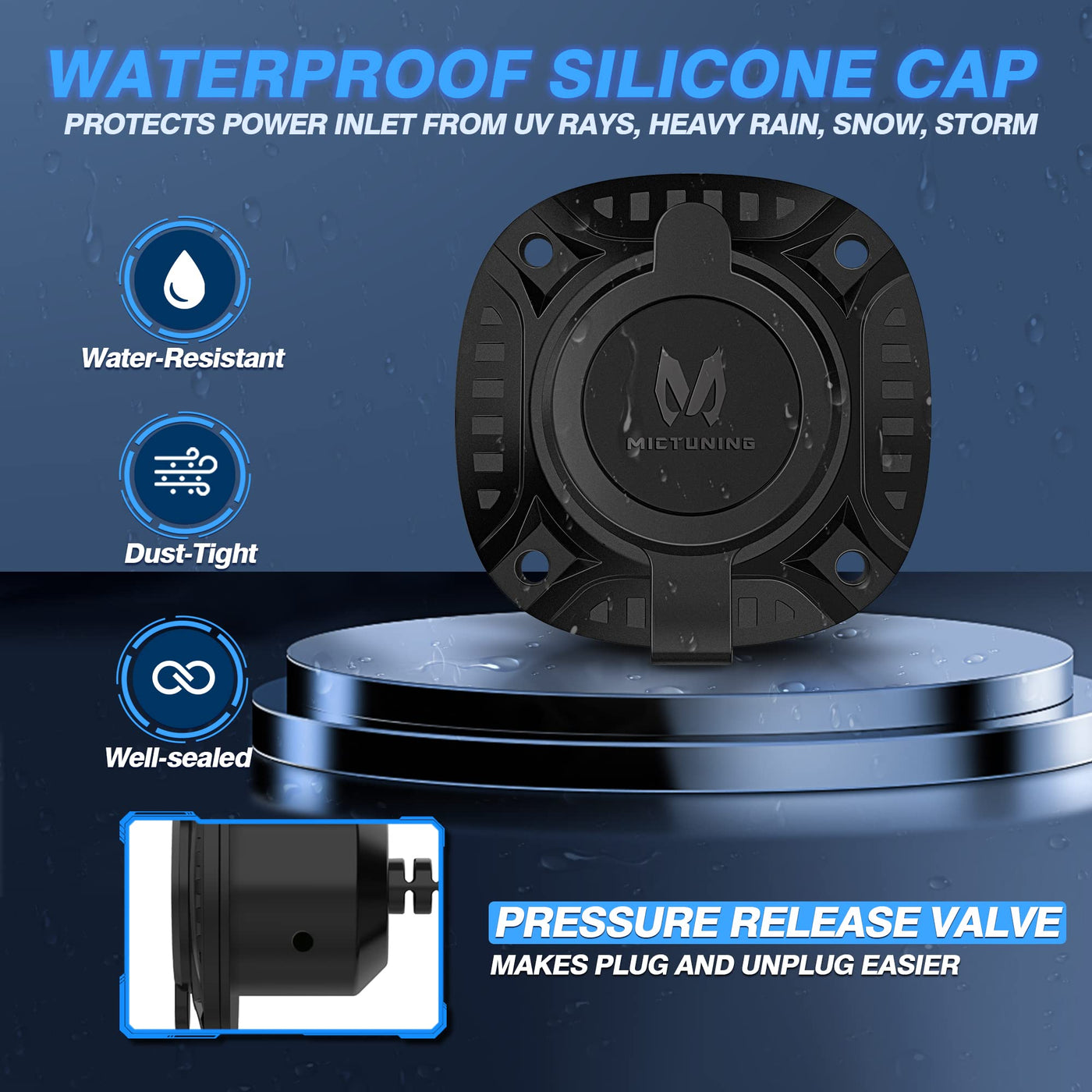 Q: Is the MICTUNING AC Port Plug weatherproof?A: Yes, the MICTUNING AC Port Plug features a snap-fit watertight cap which protects it against snow, ice, and freezing rain, making it suitable for use in harsh weather conditions.