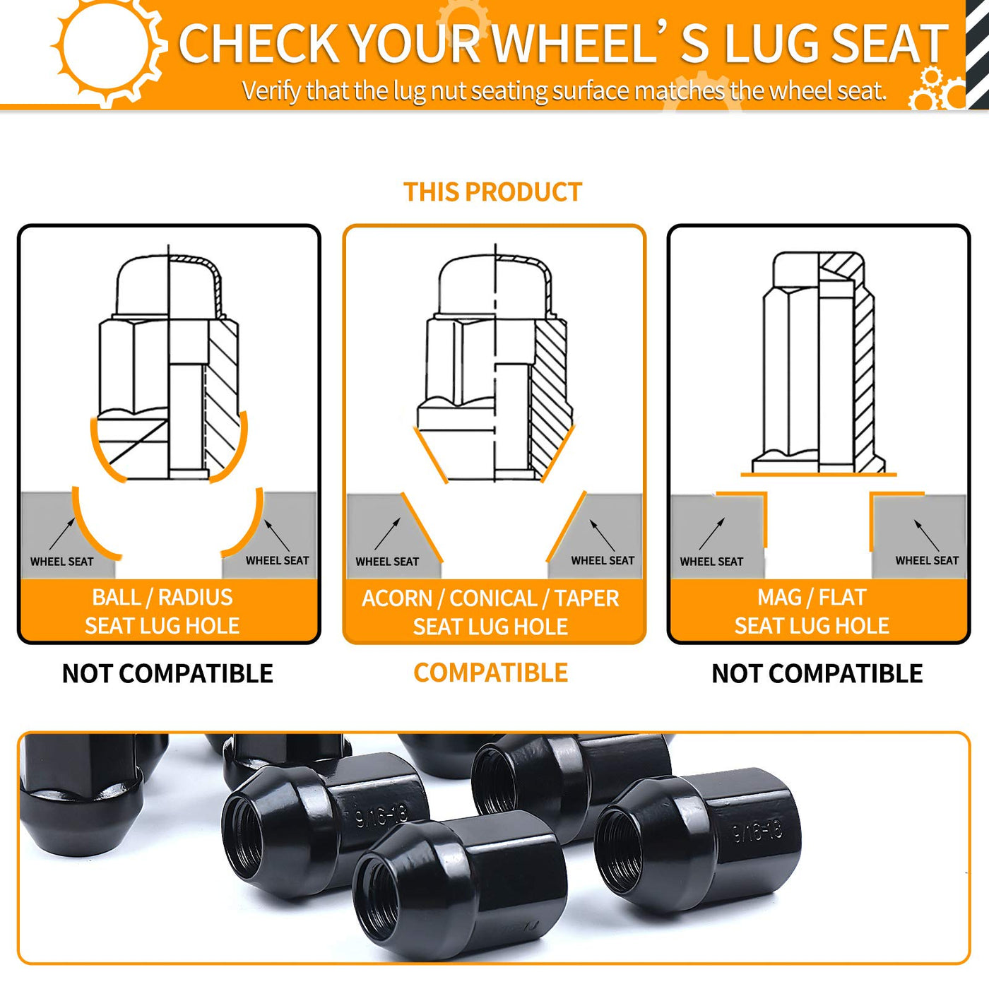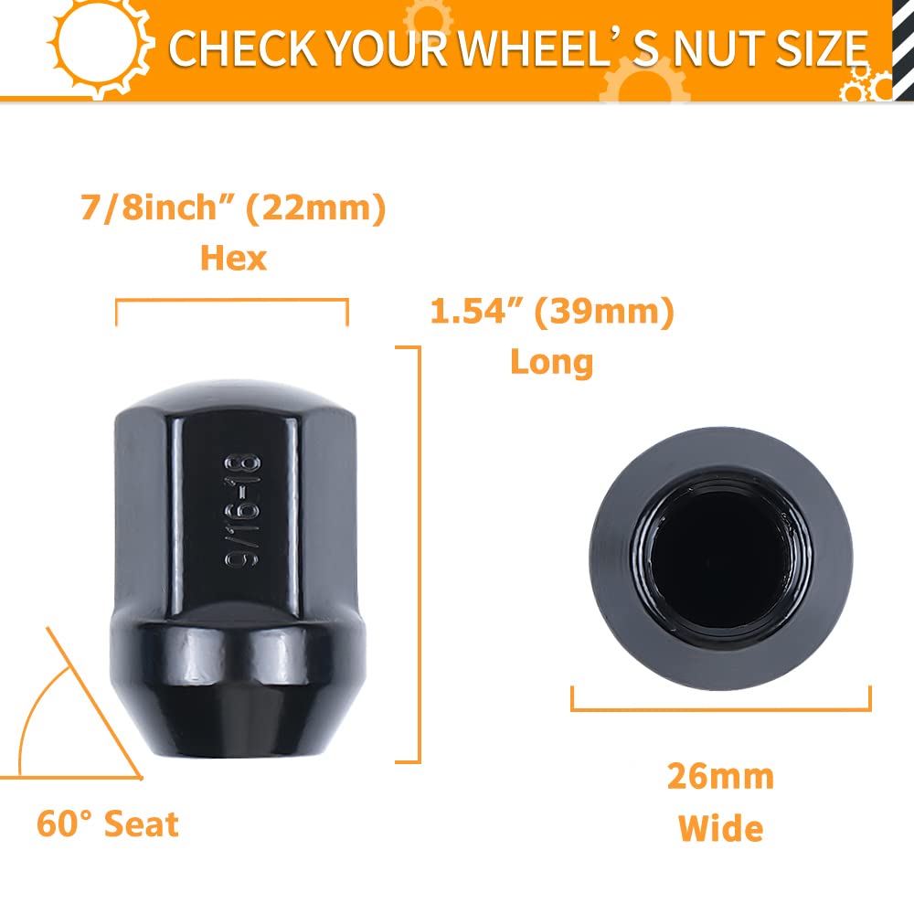 Q: What are the specifications of the MIKKUPPA Lug Nuts?A: These lug nuts feature a 9/16-18 thread, a closed-end bulge style, and a conical 60-degree seat. They have a 7/8" hex size, a height of 1.54", and are finished in black for a sleek appearance.