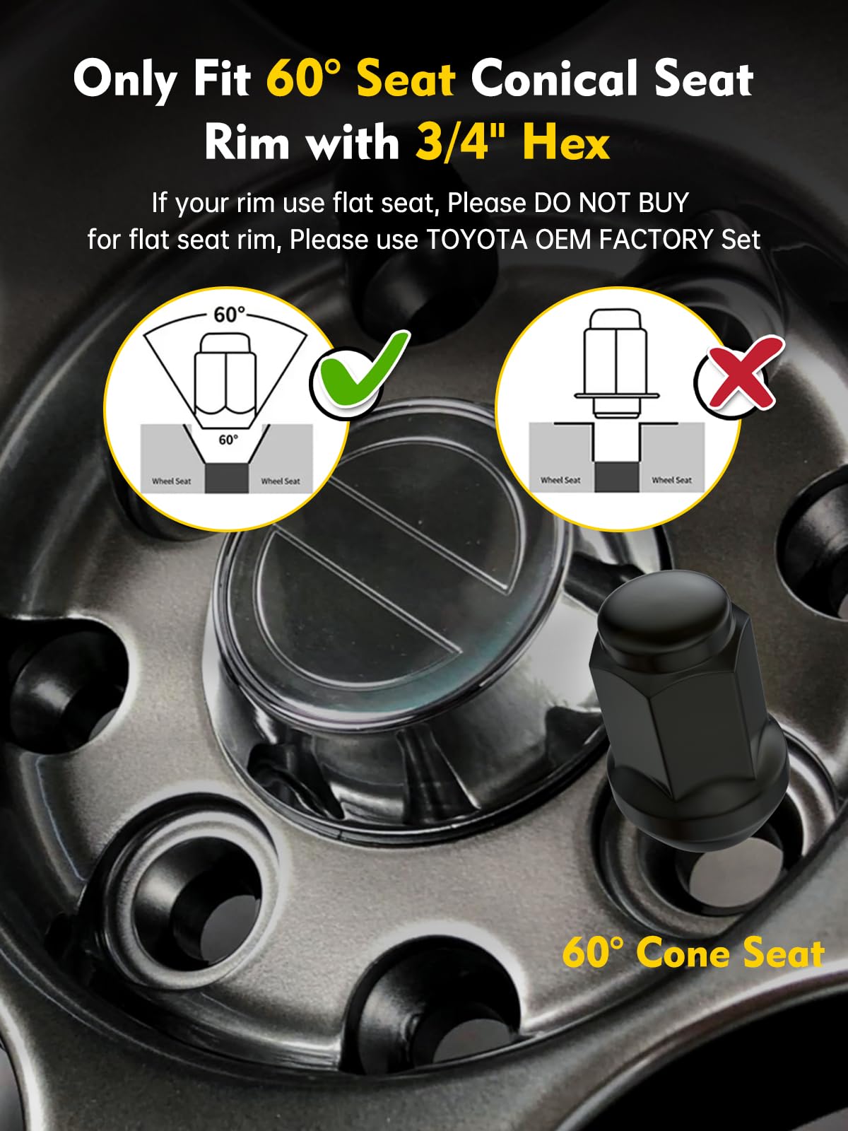 Q: How do I know if these lug nuts will fit my aftermarket wheels?A: These lug nuts have a conical 60-degree seat design, which is suitable for most aftermarket wheels with a 60-degree taper. However, they are not designed for OEM wheels with a 90-degree seat. Please check your wheel specifications to ensure compatibility.