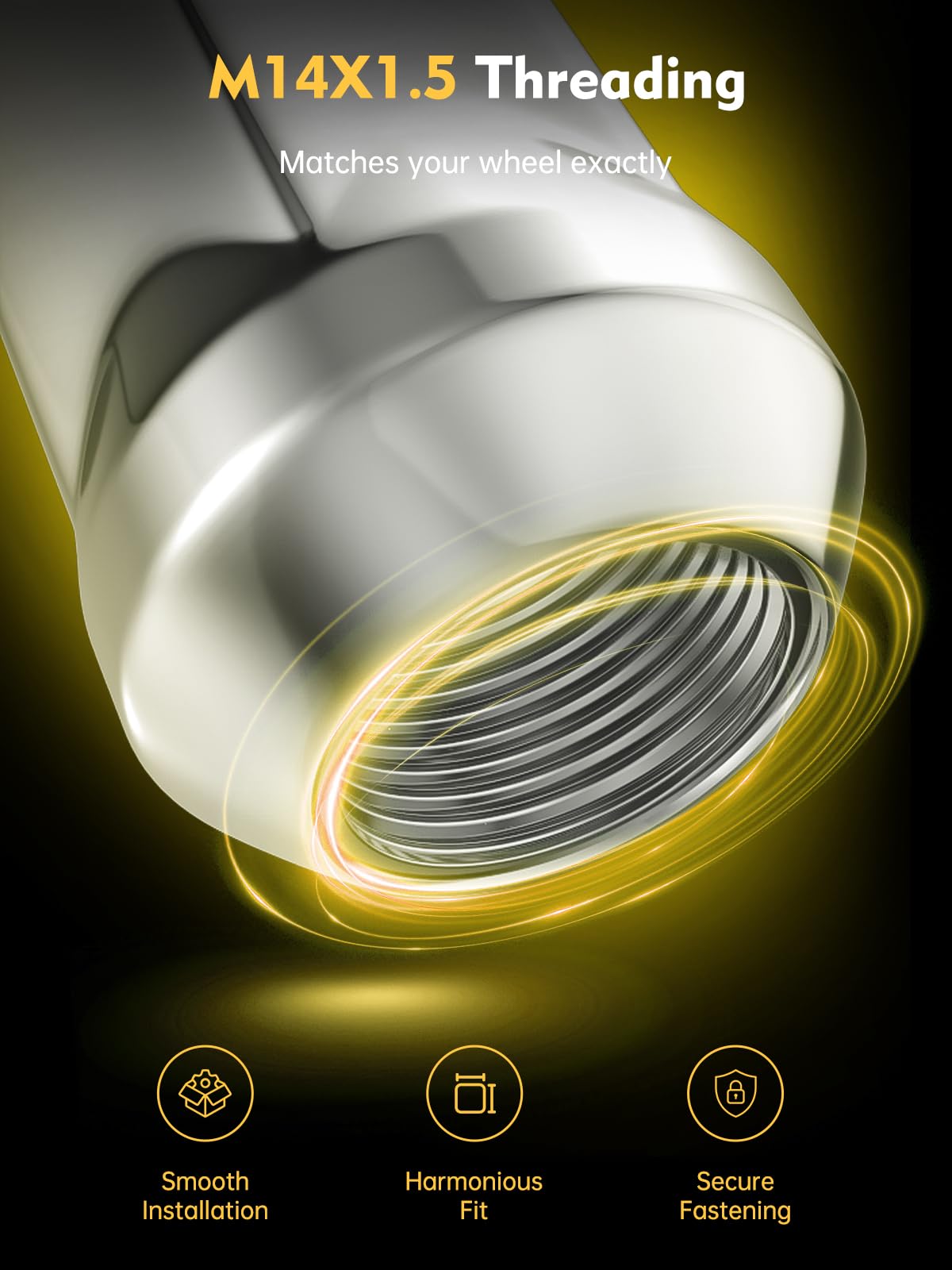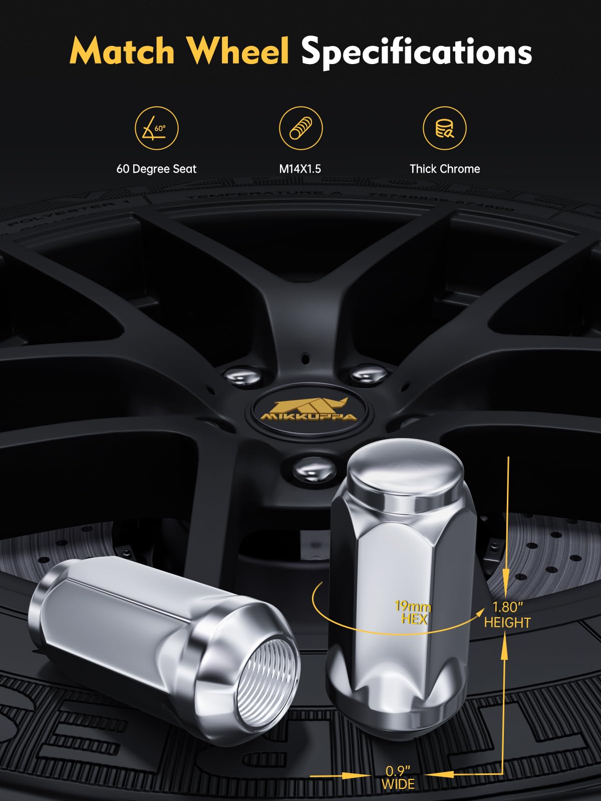Q: What are the dimensions and specifications of these lug nuts?A: Each lug nut in the MIKKUPPA set measures M14x1.5 with a 60° tapered seat. They are 1.9 inches long and 0.87 inches wide, designed for optimal performance and compatibility.