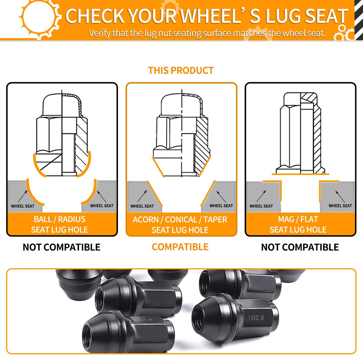 Q: What vehicles are compatible with the MIKKUPPA M14x2.0 Lug Nuts?A: The MIKKUPPA M14x2.0 Lug Nuts are designed as replacements for several vehicles, including the 2004-2014 Ford F-150, 2003-2014 Ford Expedition, 2006-2008 Lincoln Mark LT, and 2003-2012 Lincoln Navigator.