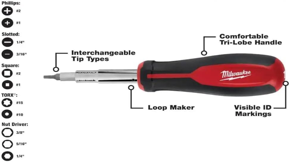 Q: What are the key features of the Milwaukee 11-in-1 Multi-Tip Screwdriver?A: The Milwaukee 11-in-1 Multi-Tip Screwdriver includes a comfortable tri-lobe handle, eight unique driver bits (Philips, slotted, square, and Torx), and two nut drivers. It is designed for durability and efficiency, making it ideal for professionals who need reliable tools for fastening specialty screws.