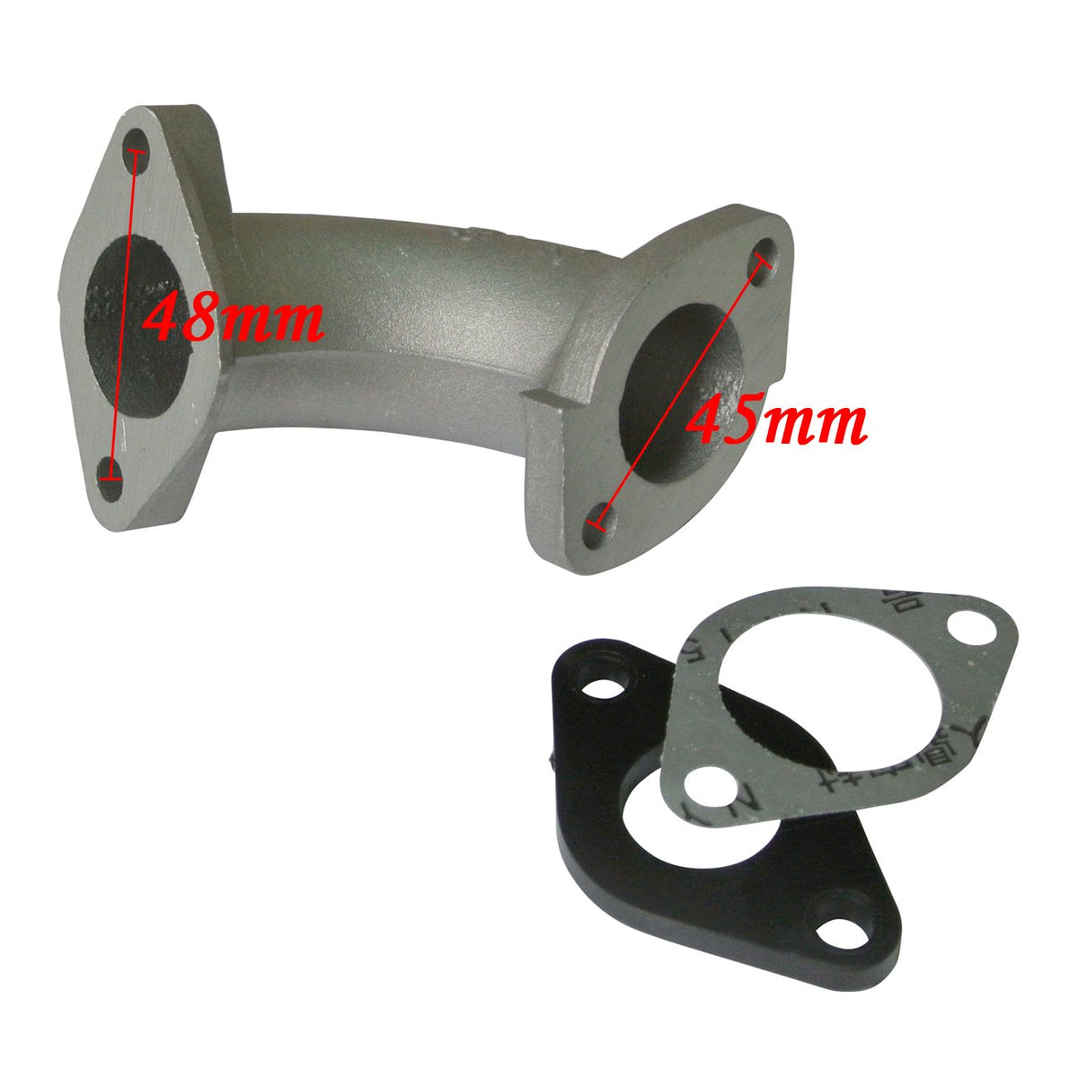 Q: How do I install the Intake Manifold Pipe?A: Installation is straightforward due to the accurate screw holes. Ensure the bolt hole spacing on the cylinder head side is 45 mm (1.77 inches) and on the carburetor side is 48 mm (1.89 inches) for proper alignment.