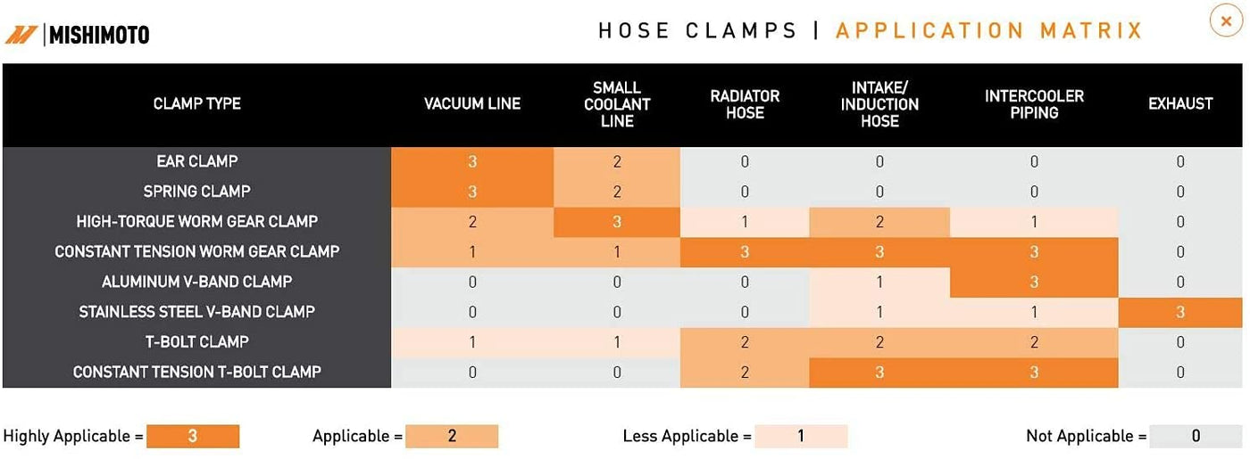 Mishimoto T-Bolt clamps are constructed from rust-proof stainless steel and offer improved durability over traditional worm gear clamps Everything will stay in place because Mishimoto Stainless Steel T-Bolt clamps are equipped with self-locking nuts Minimum clamp diameter is 338 and maximum is 37