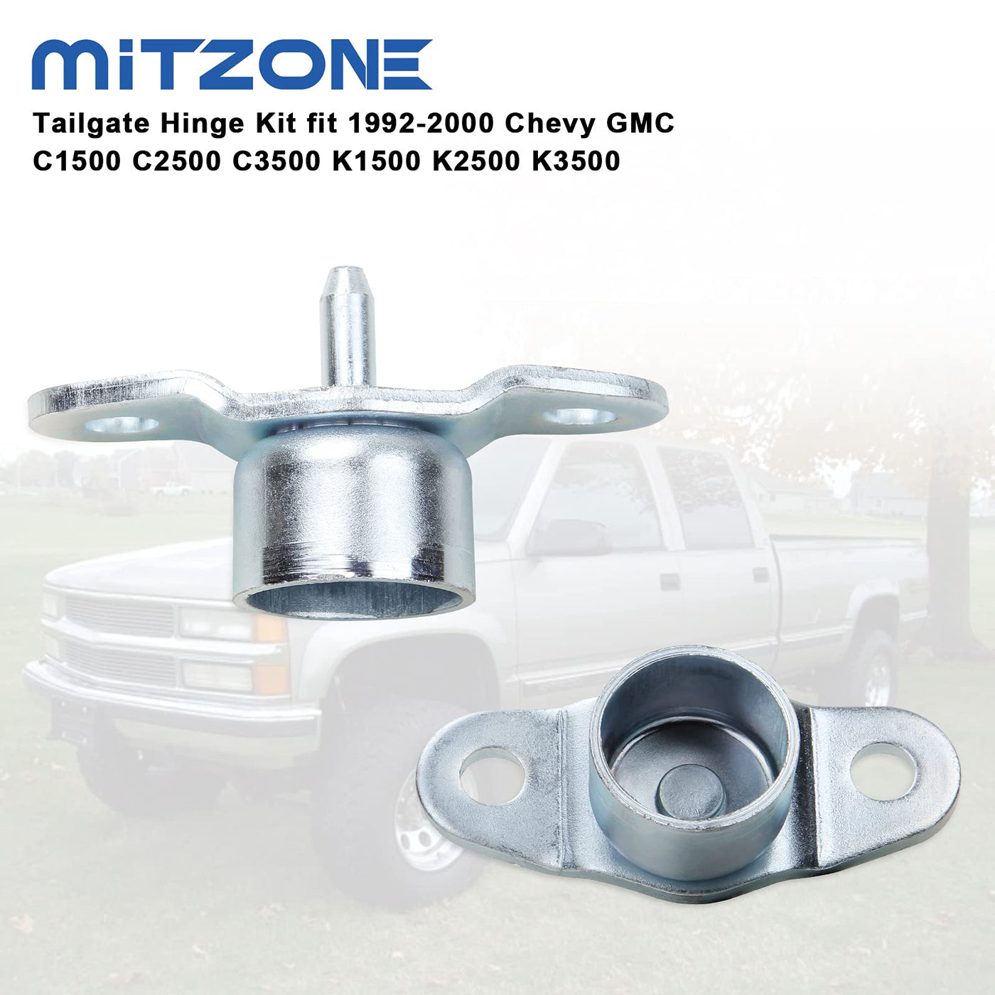 Q: What vehicles are compatible with the MITZONE Tailgate Hinge Kit?A: The MITZONE Tailgate Hinge Kit is compatible with various Chevy and GMC models including the 1992-1999 Chevy GMC C1500, 1992-2000 Chevy GMC C2500, 1992-2000 Chevy GMC C3500, 1992-2000 Chevy GMC K2500, and 1992-2000 Chevy GMC K3500. Ensure to check your vehicle's specific model and year before purchasing.