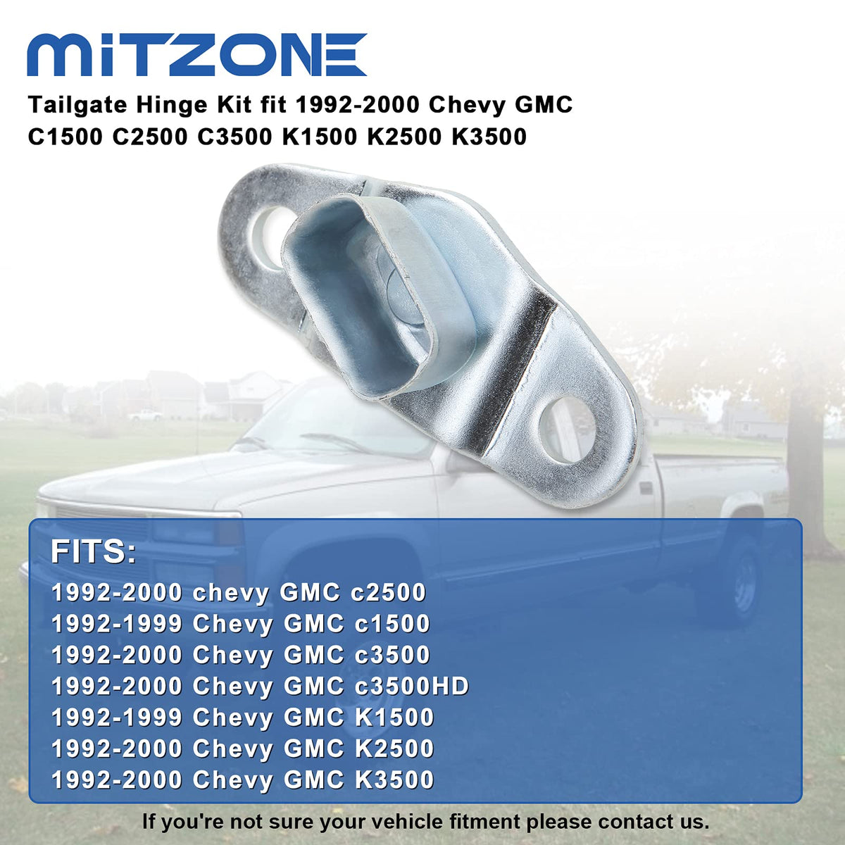Q: What vehicles are compatible with the MITZONE Tailgate Hinge Kit?A: The MITZONE Tailgate Hinge Kit is compatible with various Chevy and GMC models including the 1992-1999 Chevy GMC C1500, 1992-2000 Chevy GMC C2500, 1992-2000 Chevy GMC C3500, 1992-2000 Chevy GMC K2500, and 1992-2000 Chevy GMC K3500. Ensure to check your vehicle's specific model and year before purchasing.