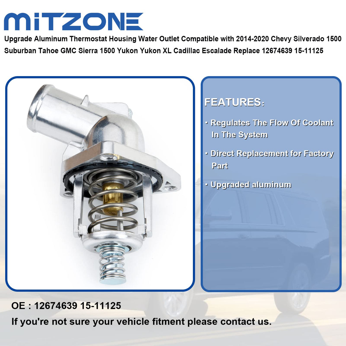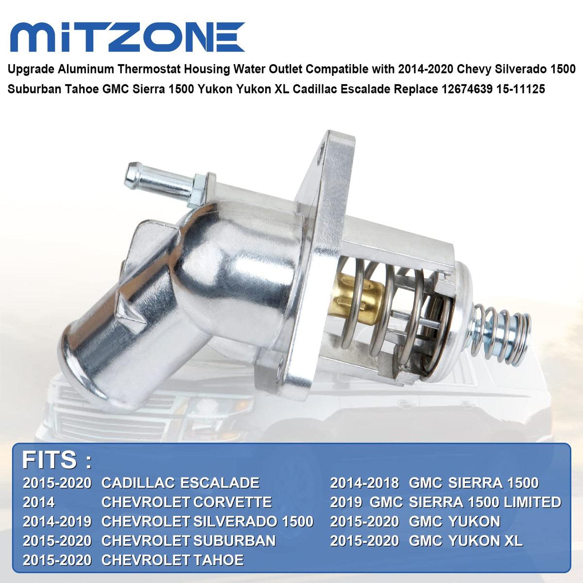 Q: What vehicles are compatible with the MITZONE Upgrade Aluminum Thermostat Housing?A: The MITZONE Upgrade Aluminum Thermostat Housing is compatible with a range of vehicles including the 2014-2020 Chevy Silverado 1500, 2015-2020 Chevy Suburban, 2015-2020 Chevy Tahoe, 2014 Chevy Corvette, 2015-2020 Cadillac Escalade, and several GMC models such as the Sierra 1500, Yukon, and Yukon XL.