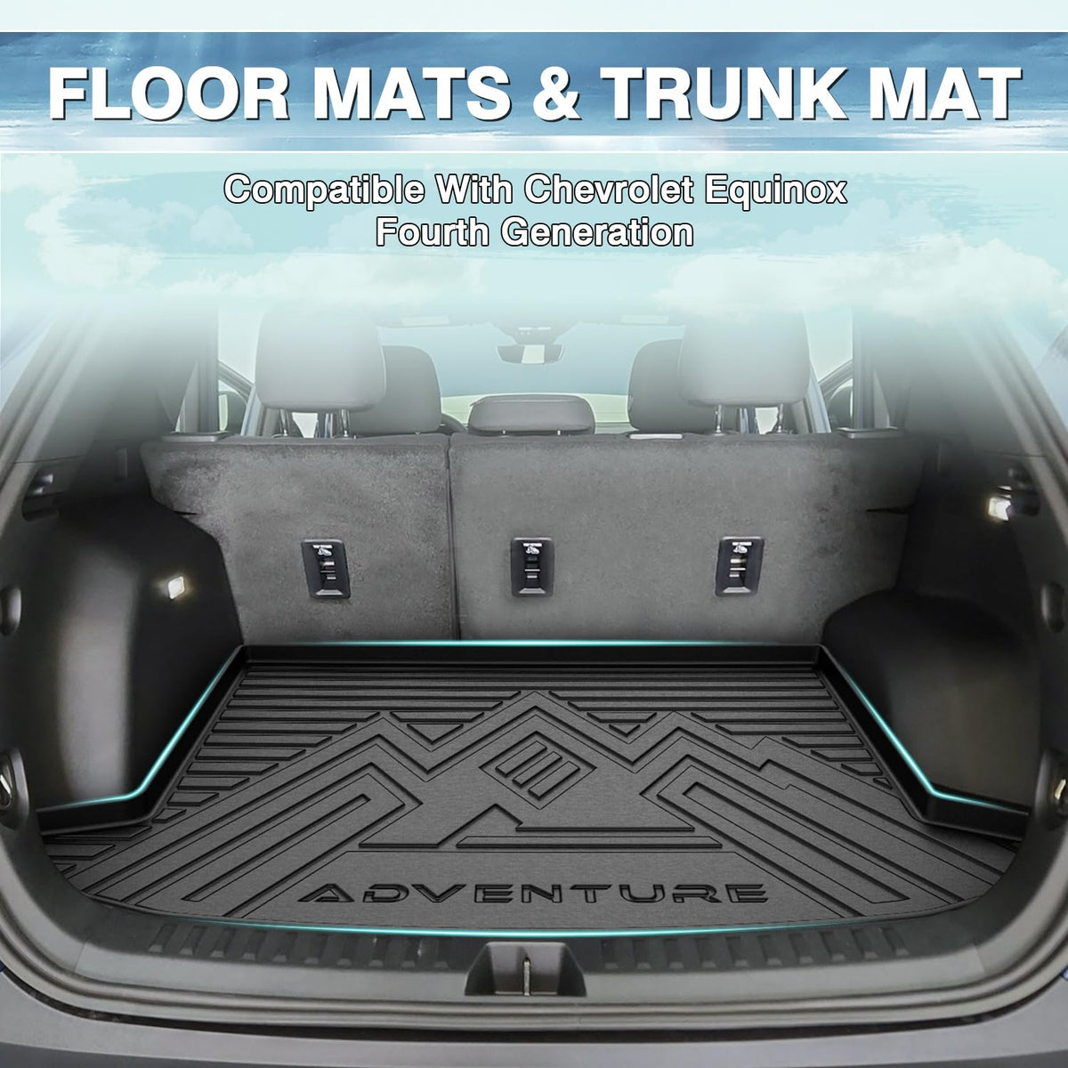 Custom Fit for Equinox Accessories: Trunk mat and floor liners are compatible with 2025 Equinox Plus . | All Season Guard and Safe TPE Material: Trunk liner and floor mats are made of premium durable TPE materials, wear-resistant, non-slip and odorless. High tensity and safe TPE material keeps its flexibility in all season while still offering an excellent feel and extreme wear resistance. | Anti-Slip and Trap Debris: Textured skid-resistant trunk mat and floor liners can prevent items from sliding around during the journey. Weatherproof cargo liner and floor mats have unique channels can effectively trap sand, water, mud, dirt, rain and muck. | Spill Blocking Sides: The cargo liner and floor mats have raised lip all the way around to stop liquids and debris from reaching your original floor. Make sure the mess stays on the liners and off your original clean car floor. | Convenient and Easy to Clean: The weatherproof and stain-resistant cargo mat and floor liners are easily cleaned by wiping with a wet towel or rinsing with water directly. *Attention: The liners are folded for shipping. Just place it under the sun to help get the creases out.