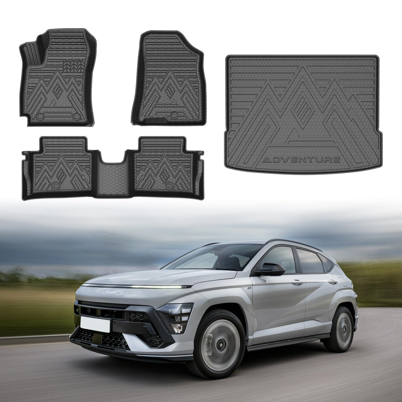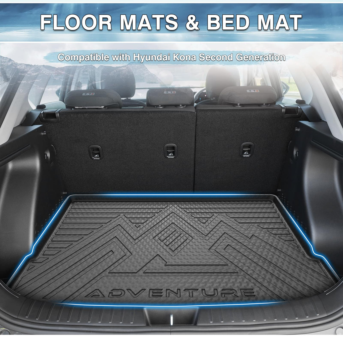 Custom Fit for Hyundai Kona Accessories: Trunk mat and floor liners are compatible with 2024-2025 Hyundai Kona (Not for Electric Model). | All Season Guard and Safe TPE Material: Trunk liner and floor mats are made of premium durable TPE materials, wear-resistant, non-slip and odorless. High tensity and safe TPE material keeps its flexibility in all season while still offering an excellent feel and extreme wear resistance. | Anti-Slip and Trap Debris: Textured skid-resistant trunk mat and floor liners can prevent items from sliding around during the journey. Weatherproof cargo liner and floor mats have unique channels can effectively trap sand, water, mud, dirt, rain and muck. | Spill Blocking Sides: The cargo liner and floor mats have raised lip all the way around to stop liquids and debris from reaching your original floor. Make sure the mess stays on the liners and off your original clean car floor. | Convenient and Easy to Clean: The weatherproof and stain-resistant cargo mat and floor liners are easily cleaned by wiping with a wet towel or rinsing with water directly. *Attention: The liners are folded for shipping. Just place it under the sun to help get the creases out.