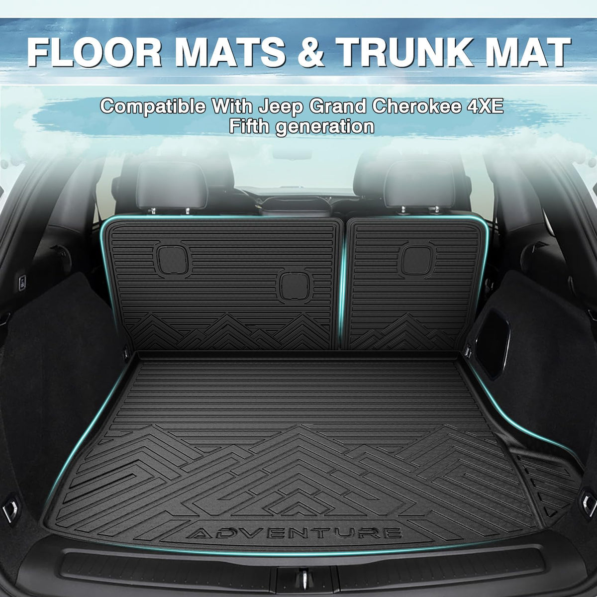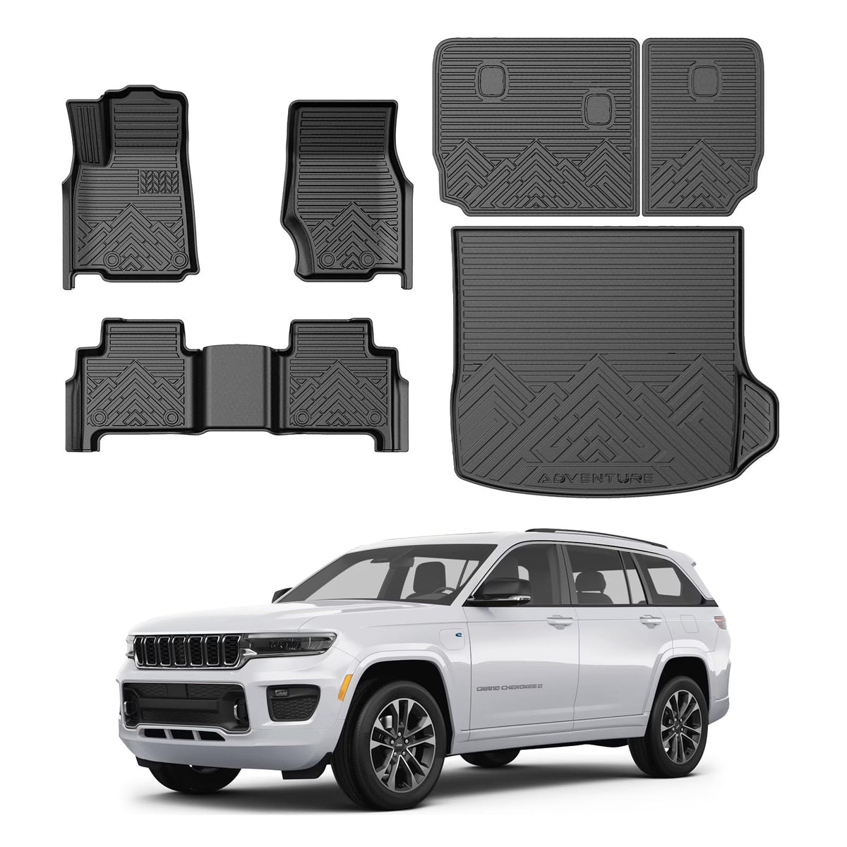 Floor Mats Cargo Liner for Jeep Grand Cherokee: Trunk mat and floor liners are compatible with 2022-2025 Jeep Grand Cherokee 4XE . | All Season Guard and Safe TPE Material: Trunk liner and floor mats are made of premium durable TPE materials, wear-resistant, non-slip and odorless. High tensity and safe TPE material keeps its flexibility in all season while still offering an excellent feel and extreme wear resistance. | Anti-Slip and Trap Debris: Textured skid-resistant trunk mat and floor liners can prevent items from sliding around during the journey. Weatherproof cargo liner and floor mats have unique channels can effectively trap sand, water, mud, dirt, rain and muck. | Spill Blocking Sides: The cargo liner and floor mats have raised lip all the way around to stop liquids and debris from reaching your original floor. Make sure the mess stays on the liners and off your original clean car floor. | Convenient and Easy to Clean: The weatherproof and stain-resistant cargo mat and floor liners are easily cleaned by wiping with a wet towel or rinsing with water directly. *Attention: The liners are folded for shipping. Just place it under the sun to help get the creases out.
