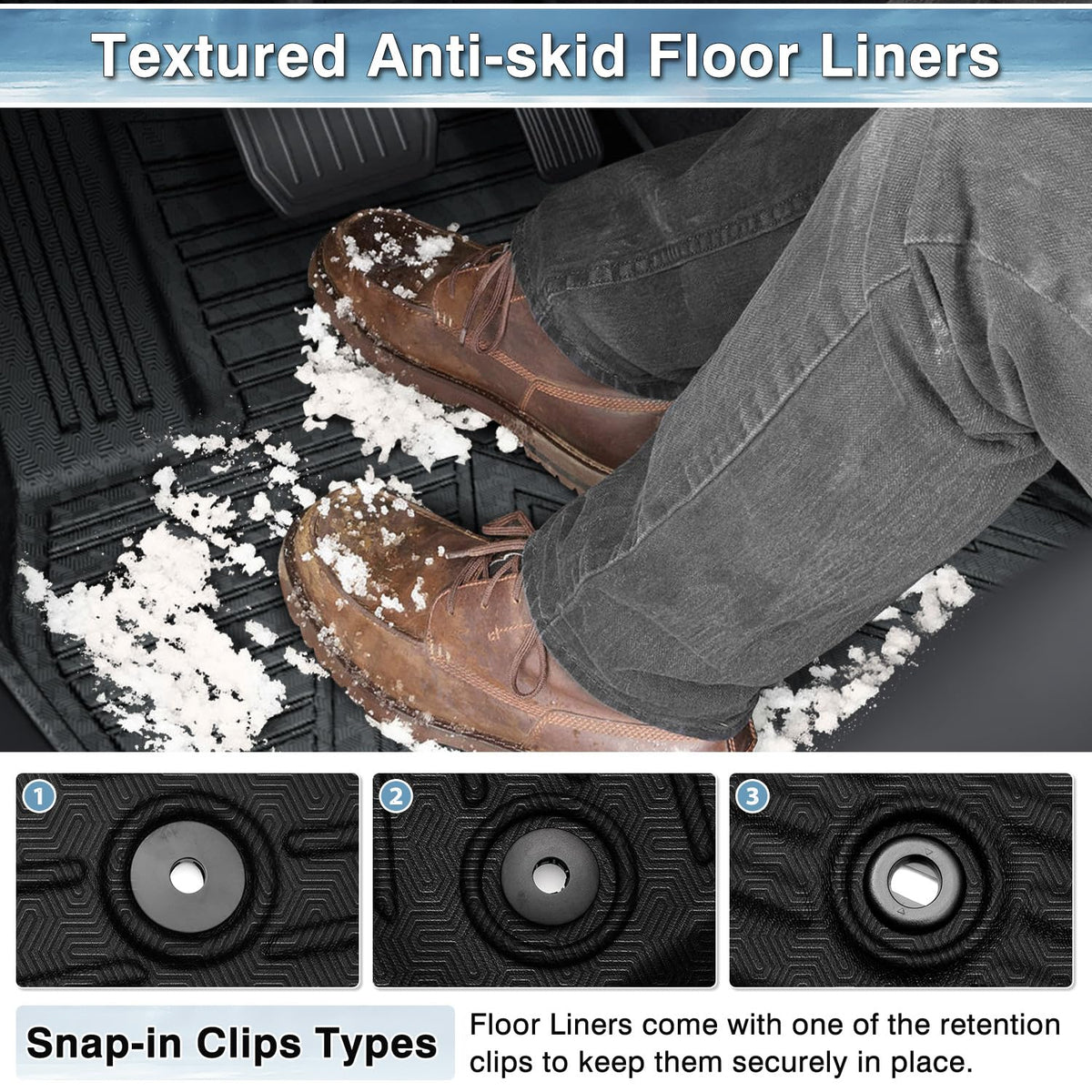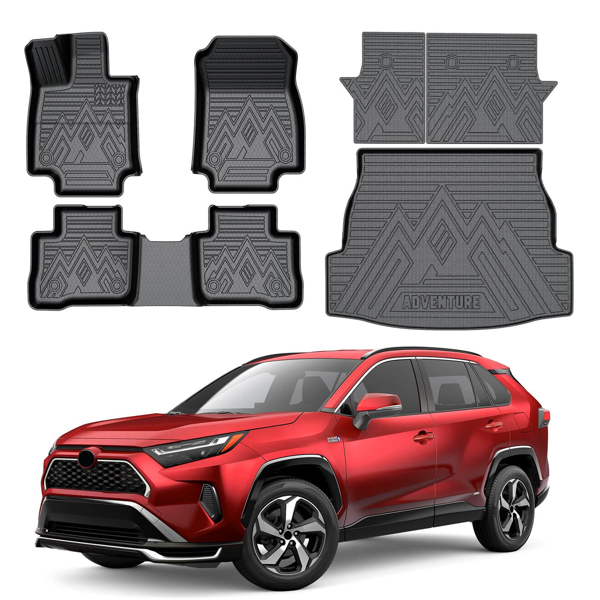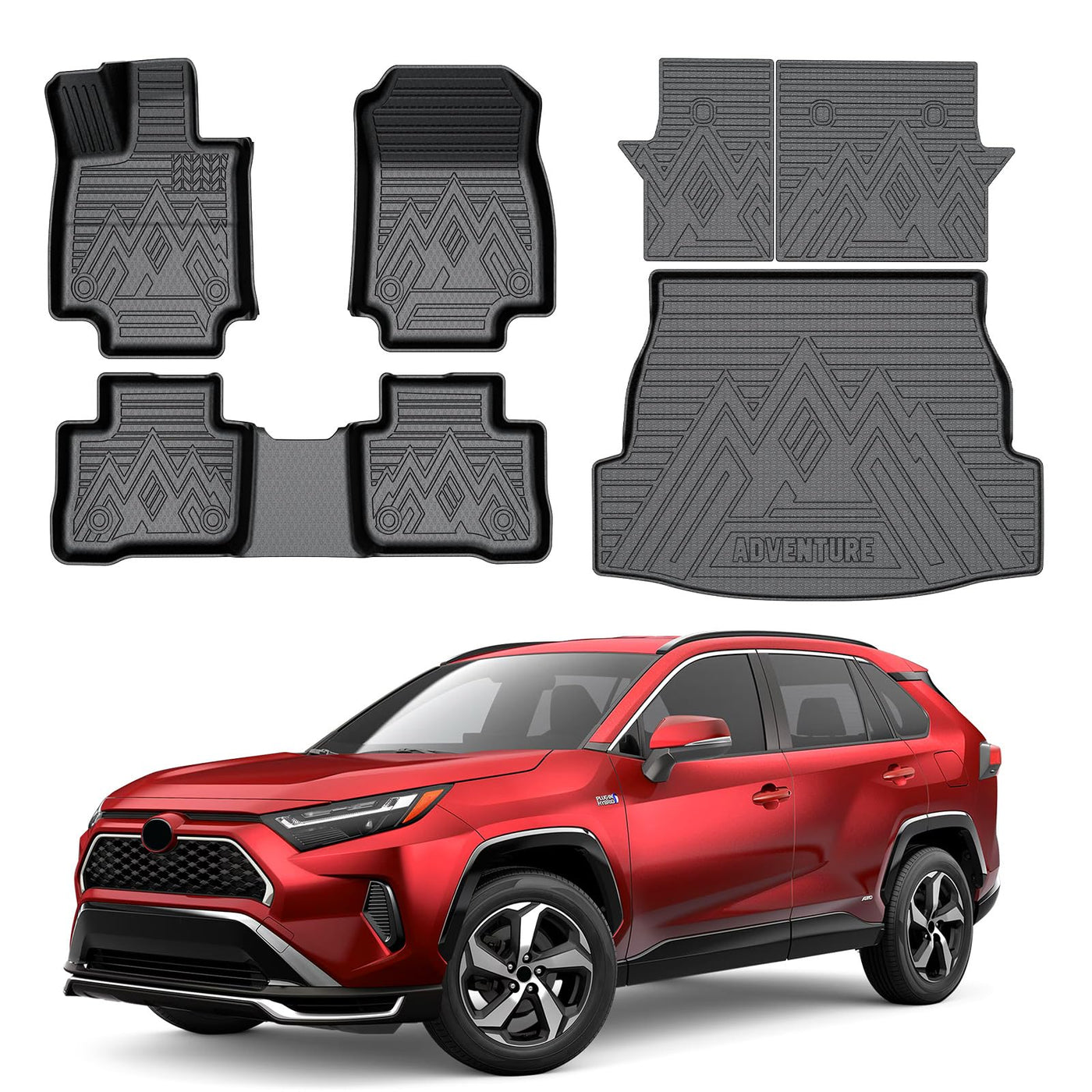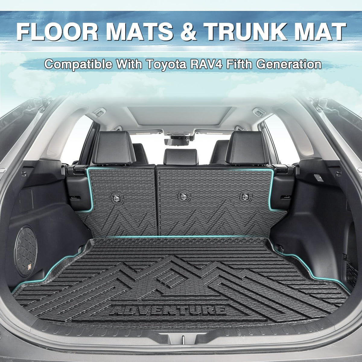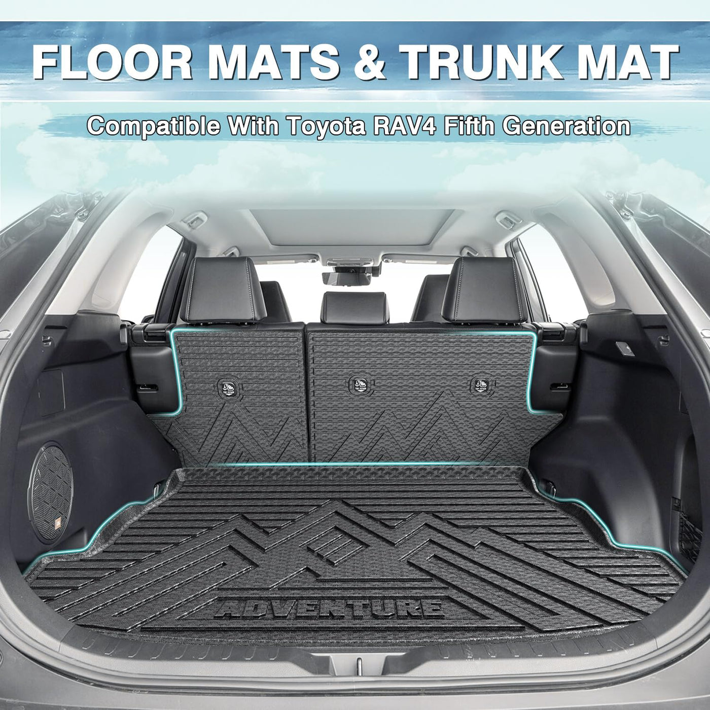 Floor Mats Cargo Liner for Toyota RAV4: Trunk mat and floor liners are compatible with 2019 2020 2021 2022 2023 2024 2025 Toyota RAV4. | All Season Guard and Safe TPE Material: Trunk liner and floor mats are made of premium durable TPE materials, wear-resistant, non-slip and odorless. High tensity and safe TPE material keeps its flexibility in all season while still offering an excellent feel and extreme wear resistance. | Anti-Slip and Trap Debris: Textured skid-resistant trunk mat and floor liners can prevent items from sliding around during the journey. Weatherproof cargo liner and floor mats have unique channels can effectively trap sand, water, mud, dirt, rain and muck. | Spill Blocking Sides: The cargo liner and floor mats have raised lip all the way around to stop liquids and debris from reaching your original floor. Make sure the mess stays on the liners and off your original clean car floor. | Convenient and Easy to Clean: The weatherproof and stain-resistant cargo mat and floor liners are easily cleaned by wiping with a wet towel or rinsing with water directly. *Attention: The liners are folded for shipping. Just place it under the sun to help get the creases out.