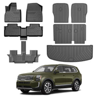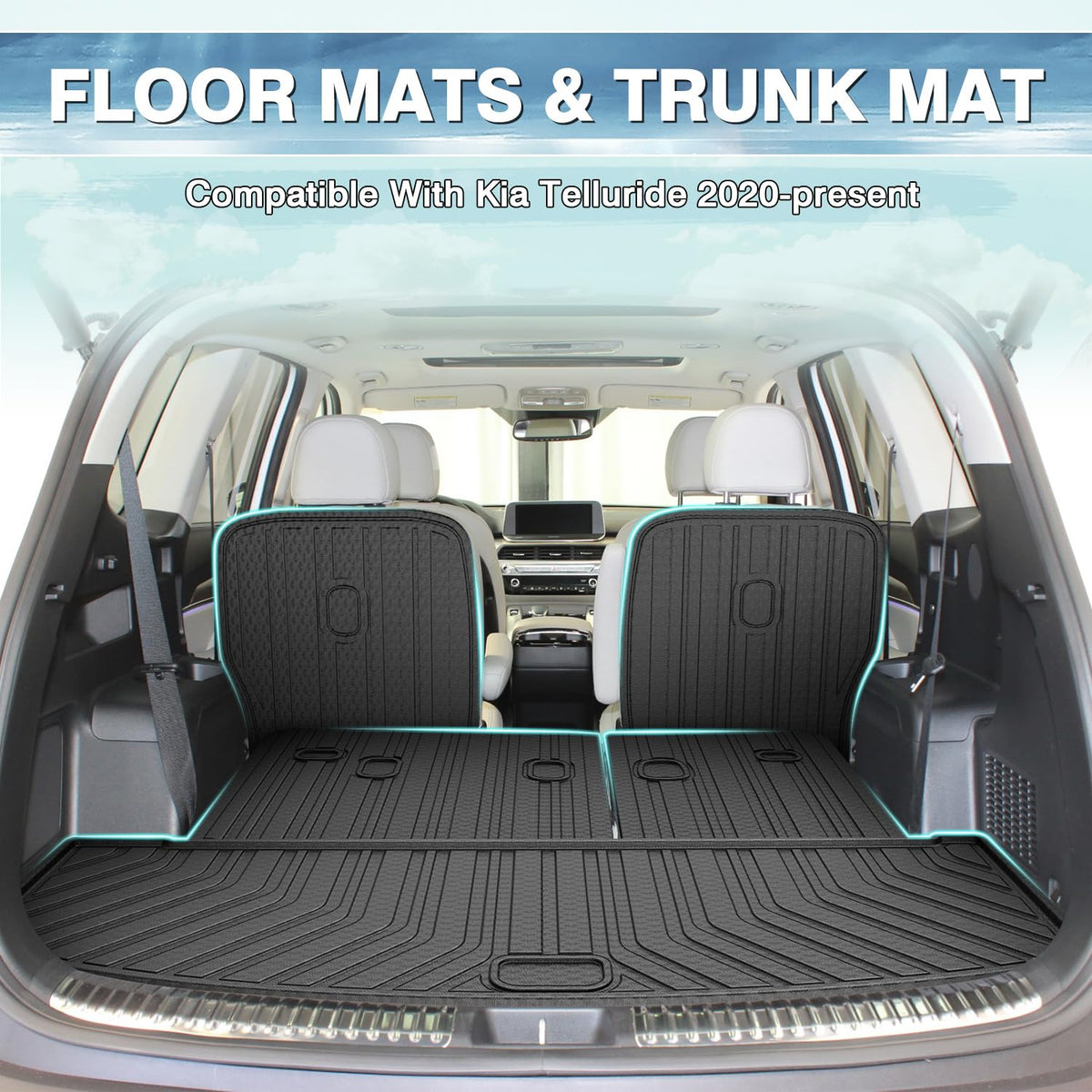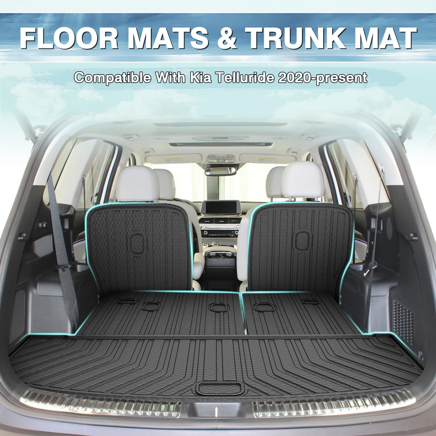 Floor Mats Cargo Liner for Kia Telluride: Trunk mat and floor liners are compatible with 2020-2025 Kia Telluride. | All Season Guard and Safe TPE Material: Trunk liner and floor mats are made of premium durable TPE materials, wear-resistant, non-slip and odorless. High tensity and safe TPE material keeps its flexibility in all season while still offering an excellent feel and extreme wear resistance. | Anti-Slip and Trap Debris: Textured skid-resistant trunk mat and floor liners can prevent items from sliding around during the journey. Weatherproof cargo liner and floor mats have unique channels can effectively trap sand, water, mud, dirt, rain and muck. | Spill Blocking Sides: The cargo liner and floor mats have raised lip all the way around to stop liquids and debris from reaching your original floor. Make sure the mess stays on the liners and off your original clean car floor. | Convenient and Easy to Clean: The weatherproof and stain-resistant cargo mat and floor liners are easily cleaned by wiping with a wet towel or rinsing with water directly. *Attention: The liners are folded for shipping. Just place it under the sun to help get the creases out.