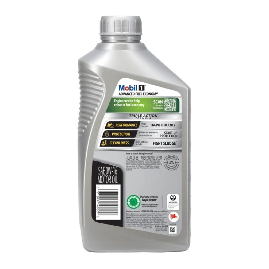 Q: What is the viscosity rating of Mobil 1 Synthetic Oil 0w16 and what does it mean?A: The viscosity rating of 0w16 indicates that this oil performs well in cold weather (0W) and has a thickness similar to a 16-weight oil at operating temperatures, providing excellent lubrication and protection.