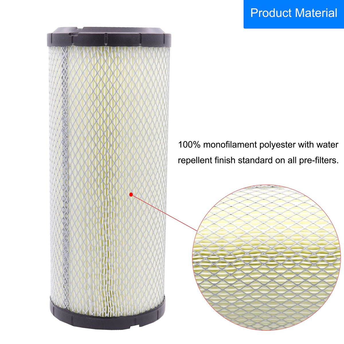 Q: What materials are used in the MOCW Air Filter?A: The MOCW Air Filter is made from high-quality monofilament polyester that features a water-repellent finish. This construction helps enhance the filter's durability and filtration capabilities, providing reliable performance in various conditions.