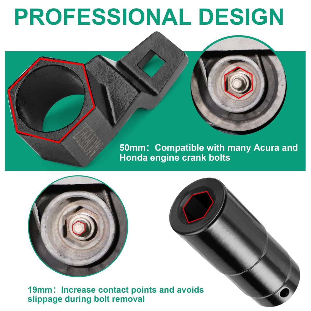 Professional Grade 50Mm Socket: Compatible With Most Honda And Acura Engines -- Perfect Design For Holding Crankshaft When Installing Crank. Small Compact And Center Hollow Design, Making The Crankshaft Pulley Wrench That Gets Into Tight Engine Spaces Easily To Removing/ Installing The Pulley Bolt. | Use 50Mm Crankshaft Pulley Remover: 50Mm Crank Removal Tool Works With 1/2-Inch Breaker Bar Or Ratchet. This Pulley Removal Tool Has A Hexagonal Design With A Hole In The Center Of The Tool That Allows The Use Of A Socket And Extension To Help Loosen Or Tighten The Pulley Bolt. | 19Mm Harmonic Balancer Socket: The Best Way To Remove A Honda Crank Bolt. Be Used On Honda Engines That Use A 19Mm Damper Bolt Or Other 19Mm Applications. 6-Sided Design Increase Contact Points And Avoids Slippage During Bolt Removal. | Use 19Mm Harmonic Balancer Socket Tool: Used With 1/2-Inch Square Drive. Balancer Sockets Are Heavy Duty Impact Sockets, Designed With More Than Three Times The Mass Of Standard Impact Sockets To Reduce Flex And Vibration, And Deliver Maximum Torque And More Energy To Remove The Bolt. | High Quality: 50Mm Crankshaft Crank Pulley Wrench Holder Is Heat Treatment Hardness With Extreme Anti-Wear Property. 19Mm Harmonic Balancer Socket Made Of Carbon Steel Electrophoresis, Heavy Duty And Durable, Anti-Peeling Paint And Rust Prevention.