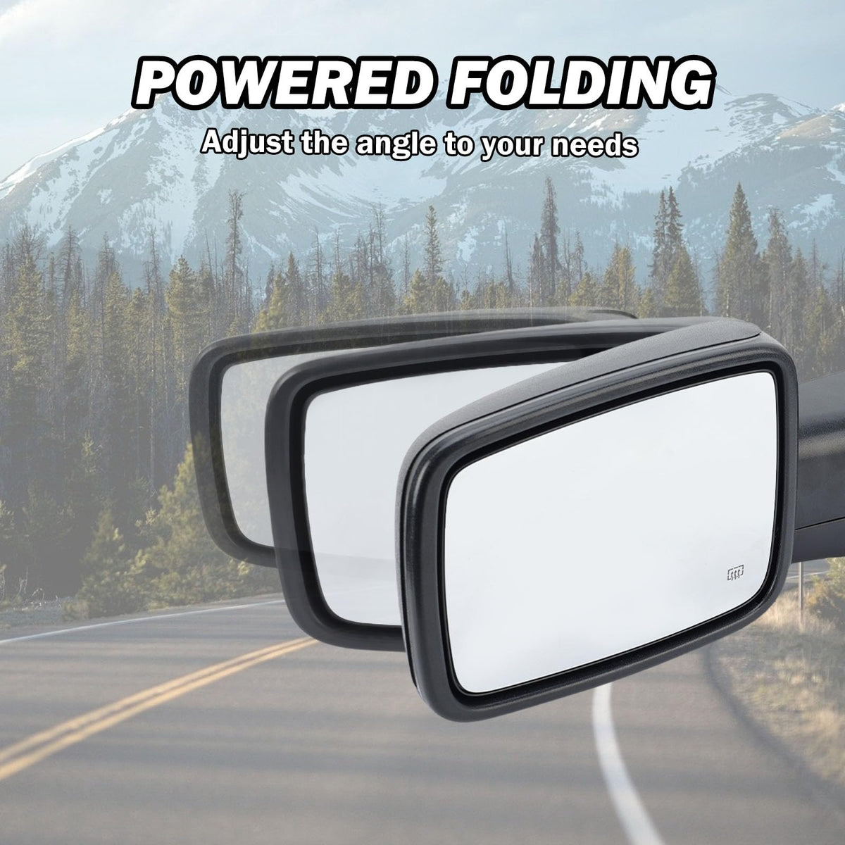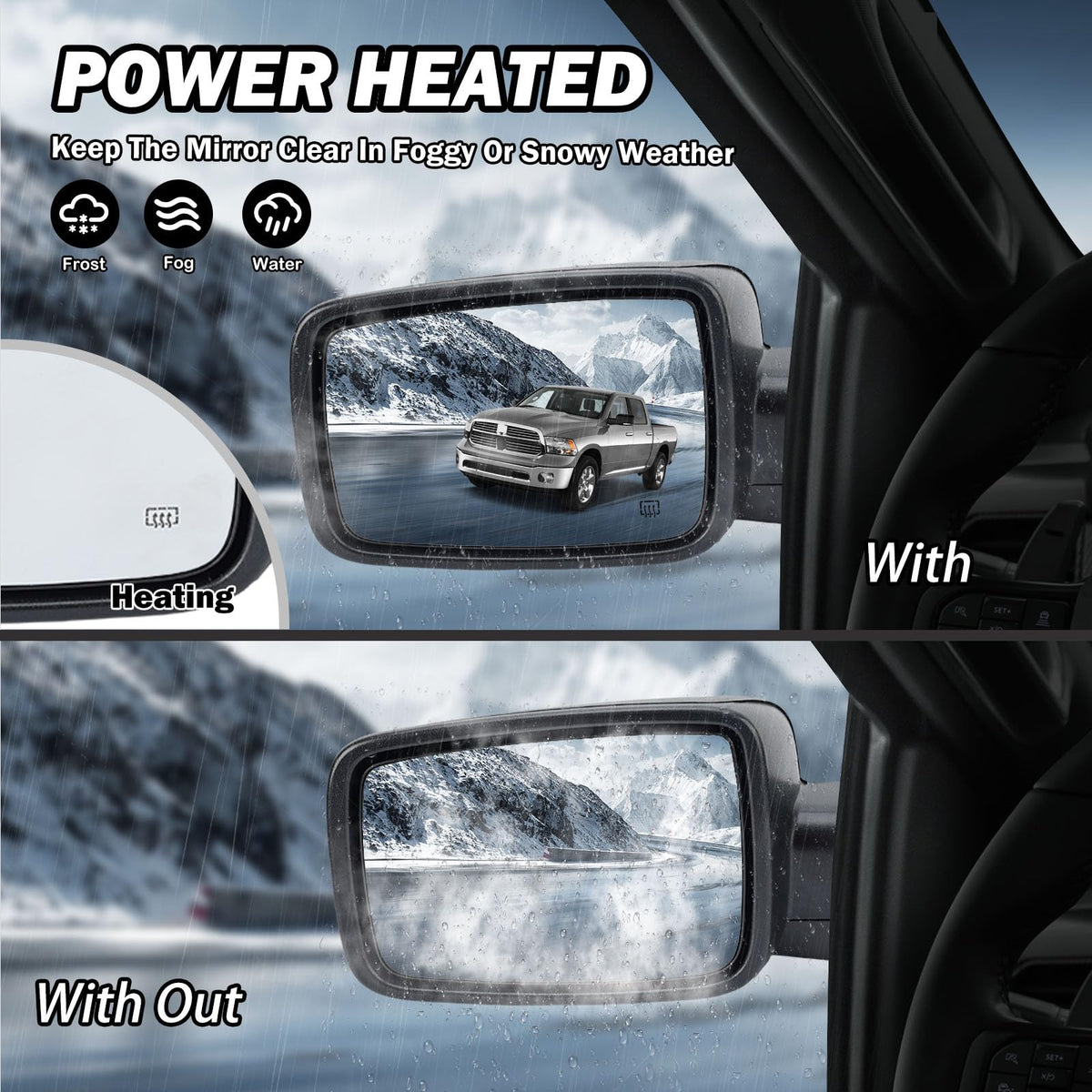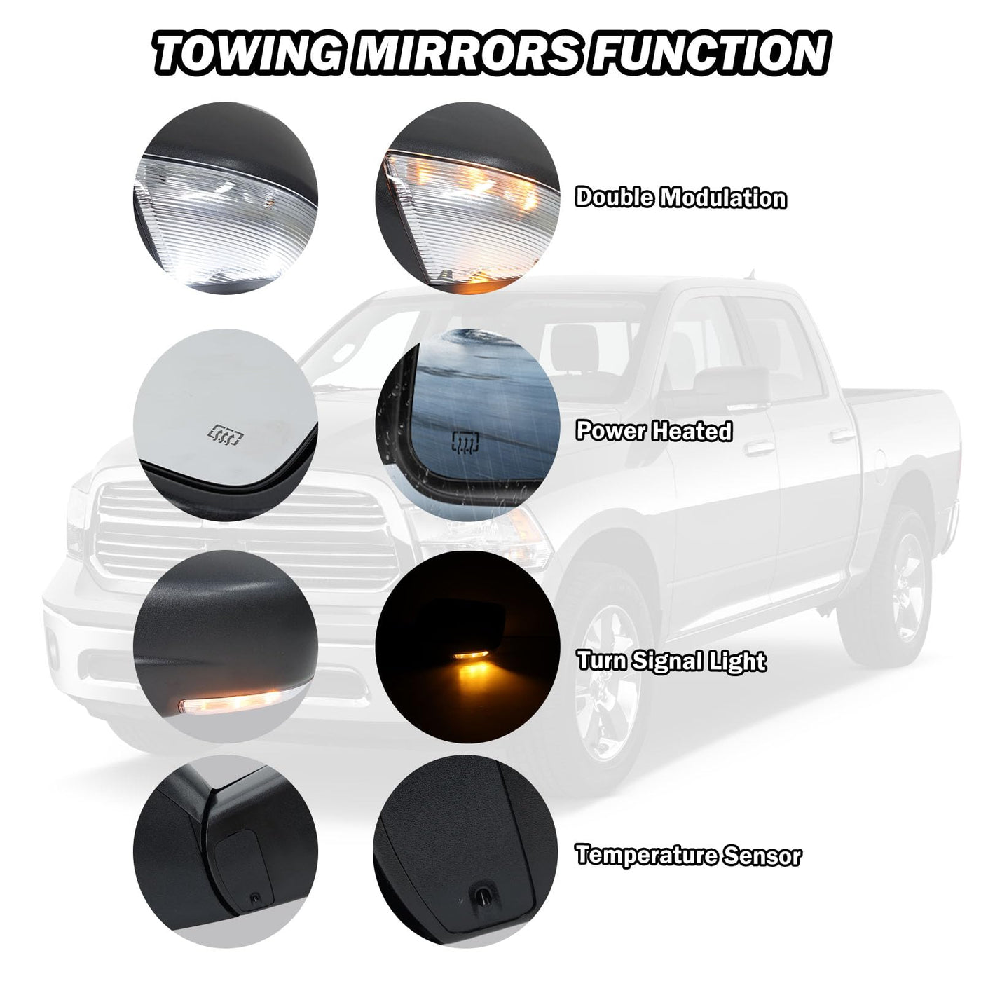 Towing Mirrors Fitment:Compatible with 2013-2018 Dodge Ram 1500/2500/3500.(Driver Side) | Mirrors Functions:Power Tow Mirror + Heated+ LED Turn Signal Light + Temperature Sensor + Puddle Lamp and Power Folding(Part Number:68147863) | High Quality:Our dodge ram driver side mirror is made of ultra-strong and black durable textured ABS plastic,provide better and wider angle of rear view. | Easy Install: No special tools needed.Our power heated mirror replacement can be easily installed by anyone with basic DIY skills,making it a quick and hassle-free process. | Check the part reference numbers to make sure it matches your Dodge Pickup Truck mirror. If you have any question, we will reply you within 2 working days.