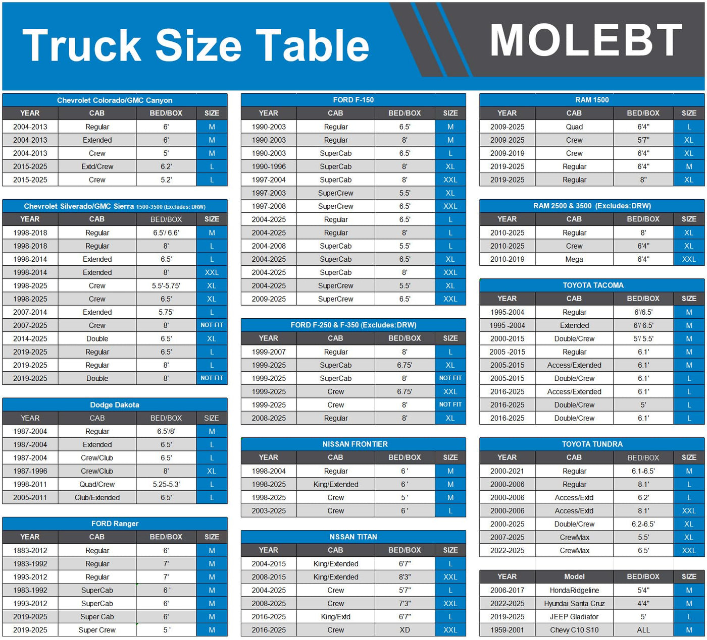 WHICH MODEL IS SUITABLE? - This all weather truck cover is Universal fit Pickup Truck Length up to 250 inch. Pay attention: If you are not sure, please measure the vehicle or tell us your truck model (Year + Model + Cab) before buying, we will help you to confirm the right size. | WHAT IS THE MATERIALS? - Molebt car cover made of high density polyester, More wear-resistant and tear-resistant.1800mm water pressure keep the cover 100% waterproof. Light weight is easy to put on and take off. | HOW ABOUT THE DETAILS? - 1.This waterproof car cover is designed with 3 windproof straps at the front middle and rear, which can be firmly bound to the car even on windy days. 2.There are eye-catching orange reflective strips on the 4 corners of the car cover, even if you park the car on the side of the road, you don't have to worry about it being hit by passers-by. 3.The full exterior covers come with storage pockets; you can easily fold and carry them. | WHAT IS THE COVER FOR? - Molebt outdoor car cover will protect your vehicle in different extreme weather. Heat protection in summer and snow ice protection in winter. In addition uv rays, sand, dust, leaves, branches, rain, frost, bird droppings etc. | LONG-TERM After-sales Service? - As a professional manufacturer of automotive exterior accessories, Molebt provides 12 months After-sales Service? .If you have any questions about this car cover, please contact us, we will give you a satisfactory answer.