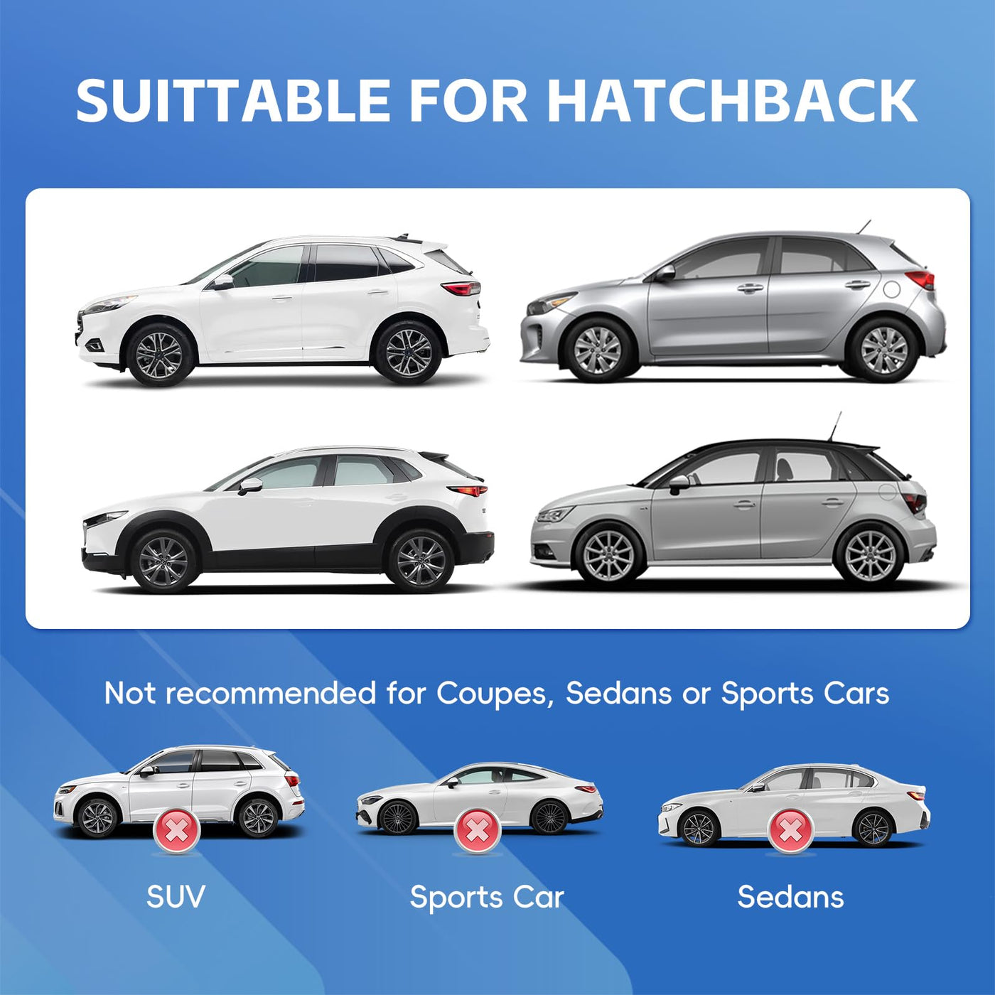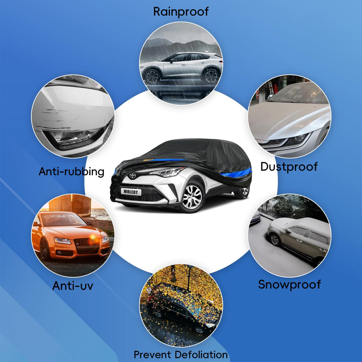 WHICH MODEL IS SUITABLE? - This all weather car cover is universal fit suv jeep up to 181 inch (Not for Sedan Hatchback). For example Ford Escape, Subaru CrossTrek/XV/Forester, Hyundai Tucson/Kona, Honda Element/HRV, Kia Soul/Sportage, Jeep Renegade, Lincoln MKC, Buick Encore, Mazda CX-30, Infiniti QX30, Toyota CHR etc. Pay attention: If you are not sure, please measure the vehicle or confirm with us before buying thanks. WHAT IS THE MATERIALS? - Molebt car cover made of high density polyester, More wear-resistant and tear-resistant.1800mm water pressure keep the cover 100% waterproof. Light weight is easy to put on and take off. HOW ABOUT THE DETAILS? - 1.This waterproof car cover is designed with 3 windproof straps at the front middle and rear, which can be firmly bound to the car even on windy days. 2.There are eye-catching orange reflective strips on the 4 corners of the car cover, even if you park the car on the side of the road, you don't have to worry about it being hit by passers-by. 3.The full exterior covers come with storage pockets; you can easily fold and carry them. WHAT IS THE COVER FOR? - Molebt outdoor car cover will protect your vehicle in different extreme weather. Heat protection in summer and snow ice protection in winter. In addition uv rays, sand, dust, leaves, branches, rain, frost, bird droppings etc. QUALITY ASSURANCE? - As a professional manufacturer of automotive exterior accessories, all weather waterproof car cover is our important product, it protects your car from weather and artificial scratches. If you have any questions about this car cover, please contact us, we will give you a satisfactory answer.