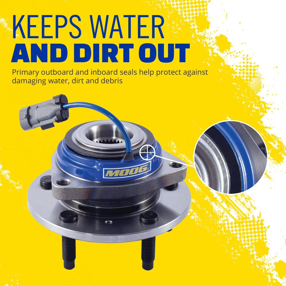 Q: What features help protect the MOOG hub assembly from environmental damage?A: The MOOG hub assembly is designed with primary outboard and inboard seals that help keep water, dirt, and debris out, ensuring reliable performance and longevity.