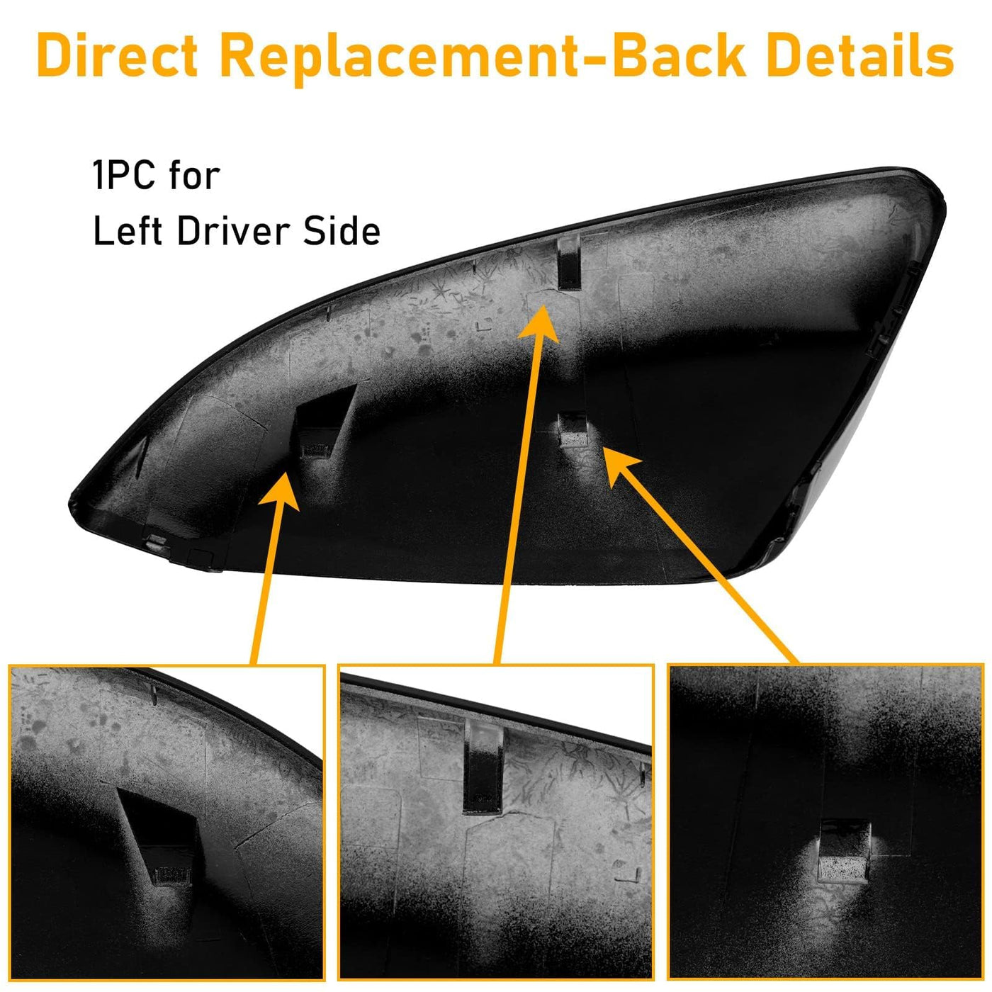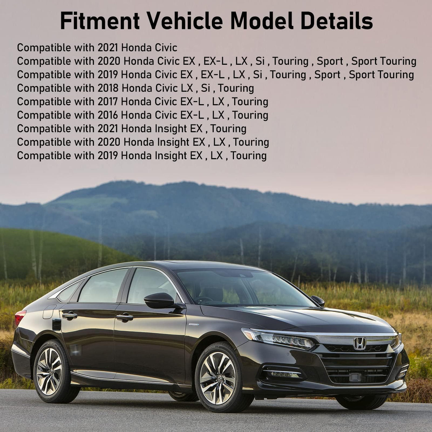 Product Introduction:Moonlinks Passengerr Side Rearview Mirror Cover Cap Compatible with 2016 2017 2018 2019 2020 2021 Honda Civic/2019 2020 2021 Honda Insight,Direct Side Mirror Cover Replacement for Right side,glossy blackWing Mirror Cover for Civic/InsightFitment:Compatible with 2016 2017 2018 2019 2020 2021 Honda Civic LX , Touring Sideview Mirror CoverCompatible with 2016 2017 2019 2020 2021 Honda Civic EX-L Sideview Mirror CoverCompatible with 2018 2019 2020 Honda Civic Si Sideview Mirror CoverCompatible with 2019 2020 2021 Honda Civic EX , Sport , Sport Touring Sideview Mirror CoverCompatible with 2019 2020 2021 Honda Insight EX , LX , Touring Sideview Mirror CoverProduct featuresMaterial: Premium ABS plasticColour: glossy blackPaintedQuantity:1 x Civic outside rearview mirrorProduct introduction:The Moonlinks Civic sideview mirror cap cover for Right Passengerr side is an actual replacement to direct replace which your Passengerr side mirror scratched or aging one.Features::1.Durable and long service life.2.Perfect side wing mirror cap replacements for your original or damaged mirror cover.3.Firmly, not easy to fall off.4.Easy to installation.5.Dont need to match the original color and paint,when one of mirror covers breaks down.Note:1.The year and model only as reference,please double-check that if your side mirror upper cover is shape as the picture before you purchase.