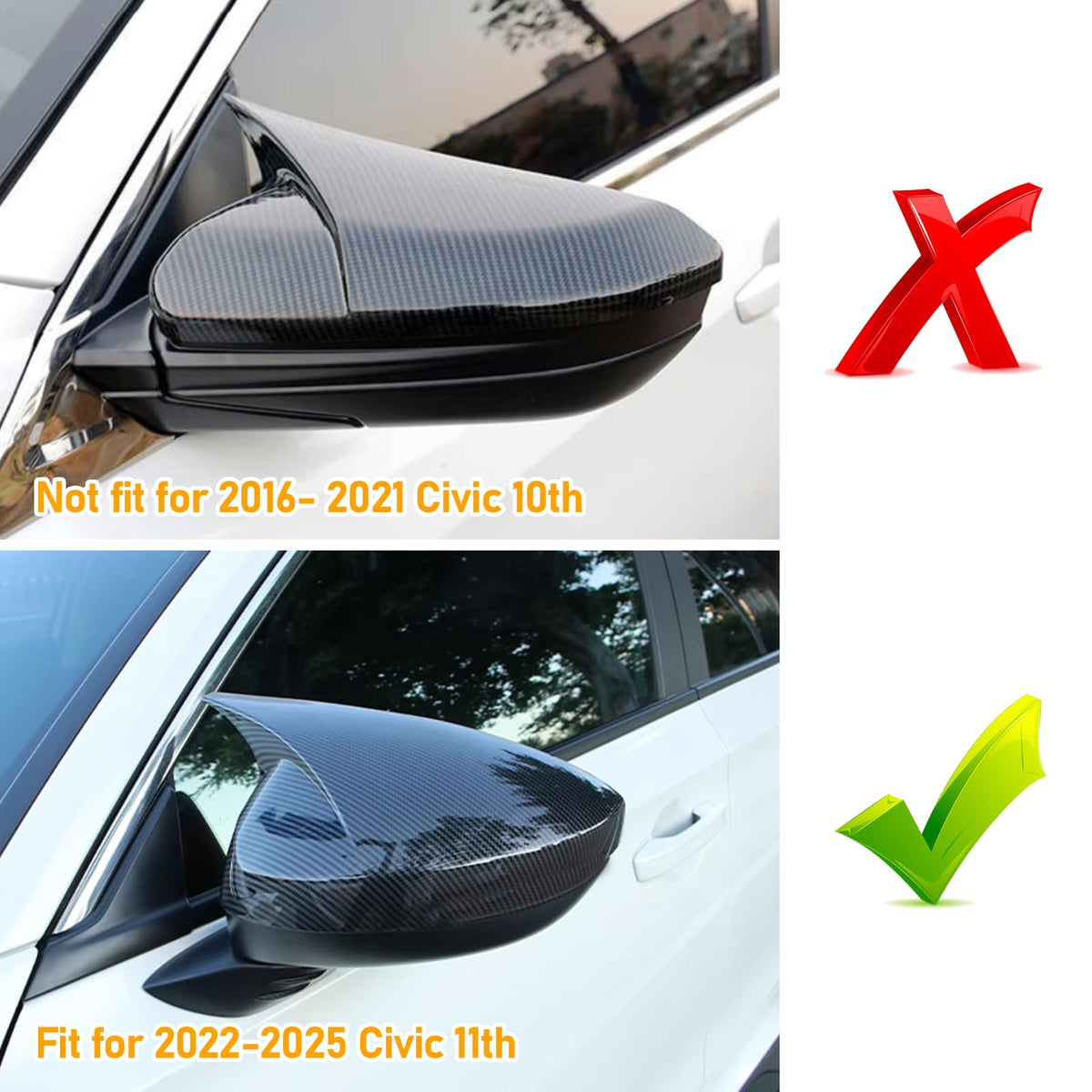 Product Introduction:Moonlinks 2PCS Driver and Passenger Side Rearview Mirror Covers Caps Compatible with 2022 2023 2024 2025 (LX EX Sport Si Sedan) (LX EX-L Sport Hatchback),Direct Side Mirror Cover Replacement for front left and Right side,Carbon Fiber Side Mirror Covers for 11th Civic,1 PairFitment:Compatible with Honda Civic EX Sedan 2022-2024Compatible with Honda Civic LX Sedan 2022-2024Compatible with Honda Civic Sport Sedan 2022-2024Compatible with Honda Civic Si Sedan 2022-2024 Compatible with Honda Civic LX Hatchback 2022-2024 Compatible with Honda Civic EX-L Hatchback 2022-2024 Compatible with Honda Civic Sport Hatchback 2022-2024Product featuresMaterial:Premium ABS plasticColour:Carbon Fiber PaintedQuantity:2 x Civic outside rearview mirror covers,for LH & RHProduct introduction:The Moonlinks Civic sideview mirror cap covers for left driver side and Right Passenger Side are actual replacement to direct replace which your driver side and passenger side mirror covers scratched or aged.Features::1.Durable and long service life.2.Perfect side wing mirror cap replacements for your original or damaged mirror covers.3.Firmly, not easy to fall off.4.Easy to installation.5.Dont need to match the original color and paint,when one of mirror covers breaks down.Note:1.The year and model only as reference,please double-check that if your side mirror upper covers are shape as the picture before you purchase.Only Fits Models WITHOUT Turn Signal Light