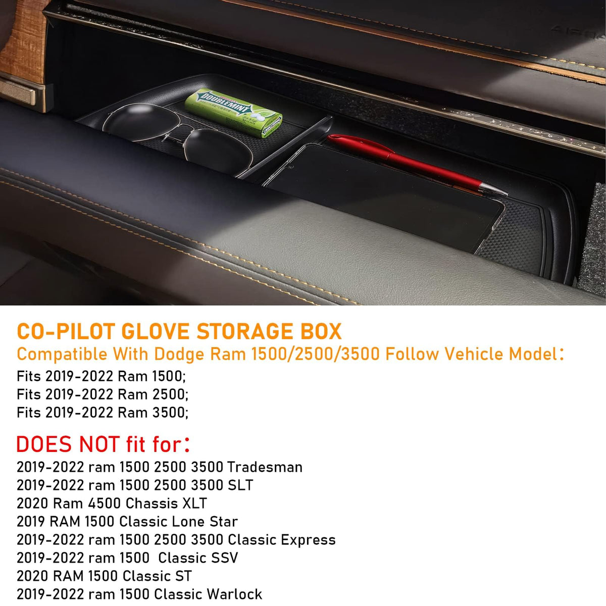 Compatible with 2019 2020 2021 2022 2023 2024 dodge ram 1500 2500 3500 vehicle modelsProduct featuresMaterial : ABS plastic with rubber padsColour : BlackQuantity : Ram console glove box organizer tray & 2 non-slip matsProduct introductionWhy do you need this upper glove box organizer tray?Add this console organizer tray to your car to keep things organized and organize your belongings more easilyThe instrument panel storage tray will not bend deeper,and are completely put into the mobile phone and other items.Easy to install and helps keep everything organized.Leave enough space for glove storage,no impact on the opening or closing of the glove box latch coverGlove storage box tray purposeIt can be used to store small objects such as keys,sunglasses,mobile phones,cigarettes,coins,etc.,which is convenient for you to find.The built-in anti-skid pad prevents objects from slipping off when drivingAll use ABS material,non-magnetic,no adhesive or glue is neededIf it is soiled by dust,it is easy to clean with water