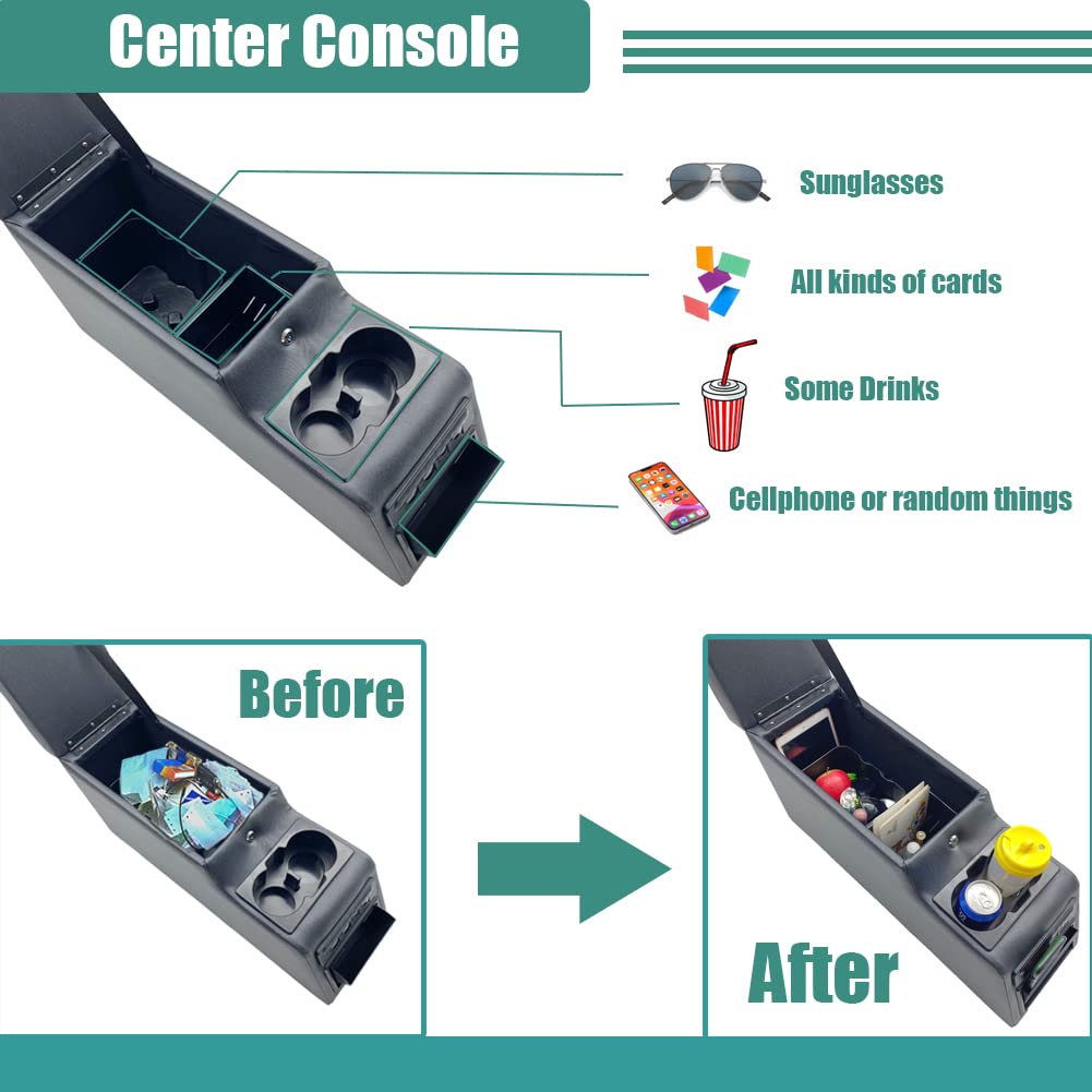 Q: What are the storage capabilities of this center console?A: The MOOSUN center console includes a large dual-locking hidden storage area, a spring action coin organizer, and a recessed cooler that can hold a six-pack of soda, providing ample space for CDs, DVDs, cassettes, and beverages.
