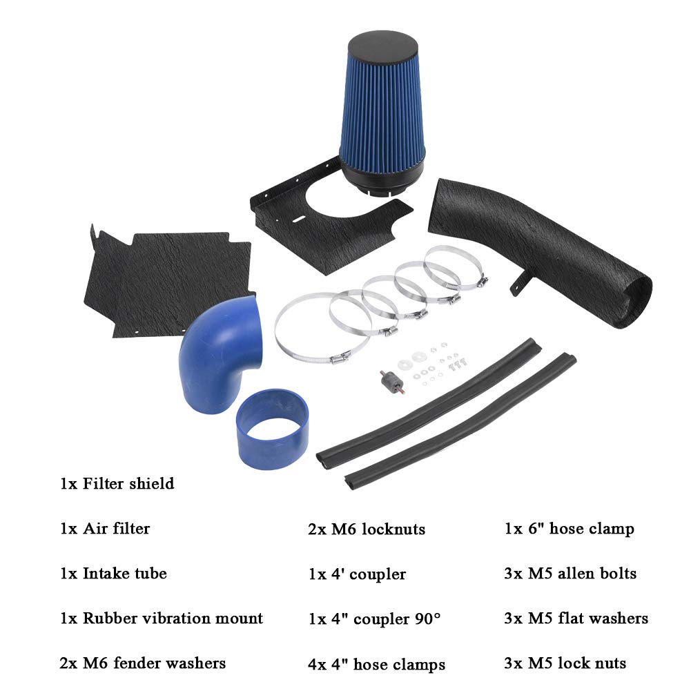 Fitment:2002-2006 Fit for Cadillac Escalade with 5.3L/6.0L V8 Engine2002-2006 Fit for Chevrolet Avalanche 1500 with 5.3L V8 Engine2000-2006 Fit for Chevrolet Suburban 1500/2500 with 5.3L/6.0L V8 Engine2000-2006 Fit for Chevrolet Tahoe with 4.8L/5.3L V8 Engine1999-2006 Fit for Chevrolet Silverado 1500 / 1500 HD with 4.8L/5.3L/6.0L Engine1999-2006 Fit for Chevrolet Silverado 2500 / 2500 HD with 5.3L/6.0L V8 Engine2001-2006 Fit for Chevrolet Silverado 3500 with 6.0L V8 Engine2003-2006 Fit for Chevrolet Silverado SS with 6.0L V8 Engine1999-2006 Fit for GMC Sierra 1500 / 1500 HD with 4.8L/5.3L/6.0L V8 Engine1999-2006 Fit for GMC Sierra 2500 / 2500 HD with 5.3L/6.0L V8 Engine2001-2006 Fit for GMC Sierra 3500 with 6.0L V8 Engine2002-2006 Fit for GMC Sierra Denali with 6.0L V8 Engine2001-2006 Fit for GMC Yukon Denali with 6.0L V8 Engine2001-2006 Fit for GMC Yukon Denali XL with 6.0L V8 Engine2002-2006 Fit for GMC Yukon Denali XL 1500 with 5.3L V8 Engine2002-2006 Fit for GMC Yukon Denali XL 2500 with 6.0L V8 Engine Package Includes:1x Powder coated steel heat shield1x High Flow Air Filter (Washable and Reusable)1x 4'' High Quality Silicone Coupler (NOT CHEAP RUBBER)1x 4'' High Quality Silicone Coupler 90 (NOT CHEAP RUBBER)......All necessary part will be included like in the picture.