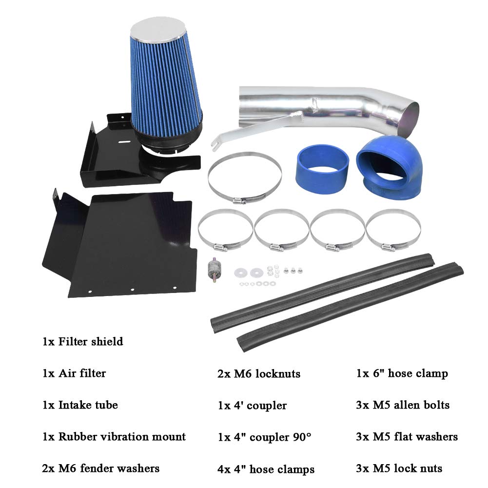 Please MATCH your vehicle on the left top before purchasing Fitment: (Fits Automatic and Manual Transmission) 2002-2006 Fit for Cadillac Escalade with 5.3L/6.0L V8 Engine 2002-2006 Fit for Chevrolet Avalanche 1500 with 5.3L V8 Engine 2000-2006 Fit for Chevrolet Suburban 1500/2500 with 5.3L/6.0L V8 Engine 2000-2006 Fit for Chevrolet Tahoe with 4.8L/5.3L V8 Engine 1999-2006 Fit for Chevrolet Silverado 1500 / 1500 HD with 4.8L/5.3L/6.0L Engine 1999-2006 Fit for Chevrolet Silverado 2500 / 2500 HD with 5.3L/6.0L V8 Engine 2001-2006 Fit for Chevrolet Silverado 3500 with 6.0L V8 Engine 2003-2006 Fit for Chevrolet Silverado SS with 6.0L V8 Engine 1999-2006 Fit for GMC Sierra 1500 / 1500 HD with 4.8L/5.3L/6.0L V8 Engine 1999-2006 Fit for GMC Sierra 2500 / 2500 HD with 5.3L/6.0L V8 Engine 2001-2006 Fit for GMC Sierra 3500 with 6.0L V8 Engine 2002-2006 Fit for GMC Sierra Denali with 6.0L V8 Engine 2000-2006 Fit for GMC Yukon with 4.8L/5.3L V8 Engine 2001-2006 Fit for GMC Yukon Denali with 6.0L V8 Engine 2001-2006 Fit for GMC Yukon Denali XL with 6.0L V8 Engine 2002-2006 Fit for GMC Yukon Denali XL 1500 with 5.3L V8 Engine 2002-2006 Fit for GMC Yukon Denali XL 2500 with 6.0L V8 Engine Specifications: Material: Aluminum Color: Blue Size: 4'' Package Included: T-306 Aluminum Polished Finished Intake pipe High quality built Washable and Reusable Air Filter A steel heat shield All necessary mounting hardwares, vacuum hoses and reducers will be included as picture Please note: this item does not include General Installation instruction