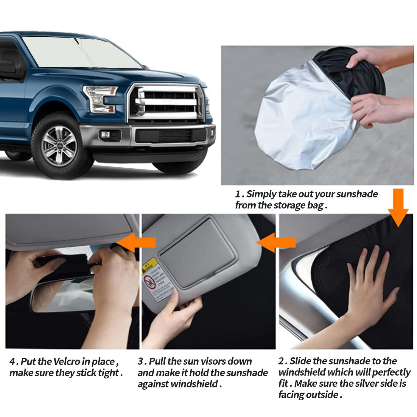Specifications: Condition: New, in retail packaging. Windshield Sunshade Compatible with Ford F150 2015-2020. Weve all seen the cracks, fading, warps, and tears that can happen as a result of years of sun damage, and this damage seriously impacts the value of your car. By using this simple-to-use sun shade, you take the worry out of the equation and can live safe in the knowledge that your autos interior will stay looking as fresh as the day you bought it! This sunshade is custom-made for your car and fits your car perfectly. Simply unfold your sunshade and place it on your dashboard, then fold it up and put it back in its handy carrier pouch once youre done, et voila, a cool, protected car, and a happy driver and passengers! Plus, just think of the money youll save on AC! You wont need to crank up the air conditioning anymore on hot days as your car will already be nice and cool. Perfect! Keep your vehicle cool and comfortable even on the hottest days. Save your hands from a scorching steering wheel. Protect yourself and others from hot seats. Prevent UV rays from destroying your cars interior by causing cracks, warps, and fading. Maintain the value of your car. Set up in seconds. Conveniently store in your vehicle.
